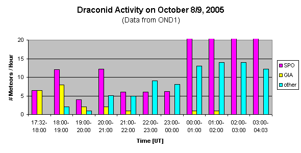 Results of the IMO Video Meteor Network - October 2005 ====================================================== Even though September was already the best month in the history of the camera network (some observations were reported after the deadline), we could significantly improve the result once more in October 2005. Let's have a look at the plain figures first: 12 observers recorded with 16 cameras in more than 1,500 hours effective observing time (best result so far: 1,140 hours in September 2005) almost 9,500 meteors (best "regular" result so far: 6,900 meteors in August 2003). That's even more than in November 2001 (8,900 meteors), when the data of the great Leonid storm in Asia an America added to the ordinary network observations. How could we achieve such phantastic numbers, even though the Orionids, the biggest shower of October, became a victim of the full moon? First of all we have to state the optimal weather in Germany. Both Joerg Strunk and Sirko Molau reported personal records with 248 and 188 observing hours for one camera, respectively. The weather was simply perfect, and if there had not been some fog in south Germany at some times, we would have recorded even 10,000 meteors. Secondly we must note, that Joerg Strunk operated under these optimal conditions (long clear nights) up to four (!) cameras in parallel. So he alone contributed 670 observing hours to the network - a result, that will hardly be beaten in the near future. A third aspect are the optimizations for Mintron cameras leading to more meteor records than in previous years. By now it has become possible to record up to a hundred meteors per night with a non-intensifed camera during the Taurids and Orionids. The best intensified cameras with 50mm tube recorded as much as 300 meteors a night, as was shown by AVIS2 and the Czech camera OND1. Last but not least, the number of observers is further growing. In October, Ulrich Sperberg has resumed observation with AKM1. The net outcome of all these factors is a results I would not have imagined before. Away from the plain figures, October still offered a number of highlights. The first was the outburst of an unknown meteor shower in the evening of October 5. Only a short time later Esko Lyytinen reported on IMO-News, that the Finish observer Jarmo Moilanen recorded 19 meteors on October 5, 11 of which originated from a sharp radiant at alpha=162 deg and delta=79 deg (not far from lambda Dra). On average, the meteors were quite bright, otherwise they would not have been recorded by a camera specialized on fireballs. At first I checked the data of AVIS2, which recorded 121 meteors that night. However, the unknown meteor shower was not prominent in these data. Things got more interesting when I had a look at the data of Mincam1 later on: Here the suspected radiant was clearly visible in the evening hours. The cameras of the other active observers (Ilkka Yrjola, Detlef Koschny, Joerg Strunk) showed this radiant also more or less clear. If all observations (without AVIS2) are taken together, we obtain the same sharp radiant as Jarmo with a geocentic velocity of 45 km/s. The following graph shows the number of sporadic meteors, meteors of the unknown shower (XXX) and other shower meteors (mainly Taurids) on October 5/6. It becomes clear that maximum activity occured between 19 and 21 UT. Since the shower was most obvious in non-intensified camera data, it must have a small r-value consisting almost only of bright meteors.Another highlight took place three days later in the European afternoon hours. Observers from Asia and Eastern Europe reported a Draconid ourburst with equivalent zenithal hourly rates up to 30 consisting mainly of faint meteors. Unfortunalety, the outburst was over in the European evening hours such that in the following night only a handful of Draconids were observed. Thanks to the early start of observation and it's high sensitivity, only the image- intensified camera in Ondrejov recorded a noticable number of Draconids belonging to the descending activity branch.