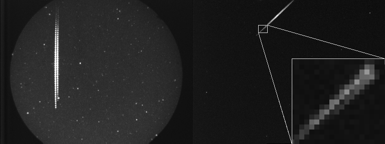 Results of the IMO Video Meteor Network - March 2008 ==================================================== A strong February was followed by a weak March. The weather was ok at the begin and end of March, but all the remaining time it was at least in central Europe unsteady and rarely co-operative. Only our two American observers enjoyed better weather and collected most observing time of all. Thanks to the constantly large number of observers (the data from three cameras are still missing), we managed to record once more almost 3000 meteors in well above thousand hours of observing time. The highlight of last month was reported from Brannenburg: On March 6, 00:09:50 UT, Wolfgang Hinz recorded an unusual double meteor (Figure 1, left). It's not unusual because two meteors appeared by chance at the same instant, but because they appeared in parallel and exactly at the same time. In the course of the years I have seen hundreds of thousand video meteor from the camera network, but this one is unique. I was still thinking about a "terrestrial" explanation for this event (one camera, for example, recorded reflections for some time, that looked remarkably similar - but they appeared for all bright meteors) when I received a message that Wolfgang had recorded another double meteor of the same type on March 9, 23:35:44 UT (Figure 2).Figure 1: Double meteor from March 6, 2008, recorded by Wolfgang Hinz with AKM2 (left). The same meteor was captured by Sirko Molau from Seysdorf with MINCAM1 (right). Here only one meteor is visible on the first glimpse, but the second one becomes visible at high magnification. What a strange coincidence, but after a longer inspection of the recording birds, insects and other artefacts could be ruled out. Then I remembered that the fields of view of AKM2 and MINCAM1 overlap partly. Indeed I found that at least the first meteor was recorded by both cameras (Figure 1, right). However, the recording of Mincam1 showed only one meteor. Only at higher magnification it became clear that this meteor was "split". In fact, both meteors were recorded by MINCAM1, but they were not as clearly separated because of the lower scale and maybe also because of the different geometry.