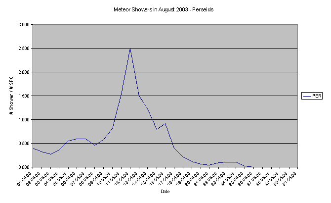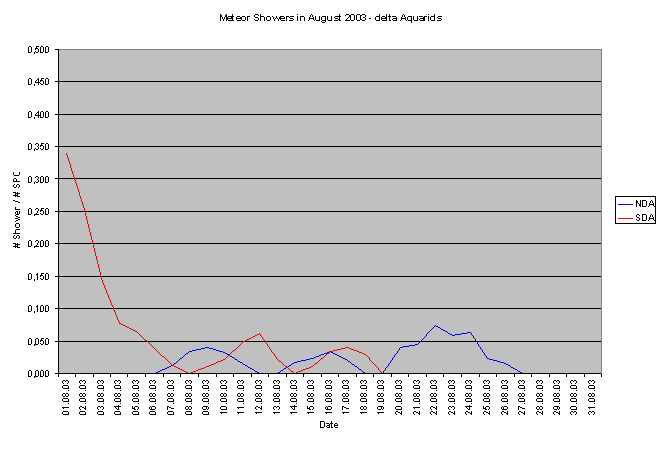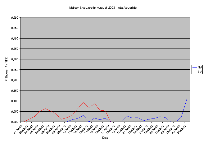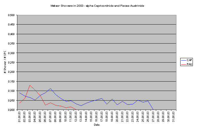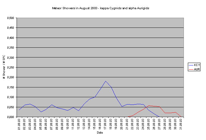 Results of the AKM Video Meteor Network - August 2003 ===================================================== 45 observing nights in a row? A dream? No, it's possible! In Australia? In the Sahara desert? No, in central Europe, or in more detail: In Germany! Unbelievable, but true: I managed to observe between July 28 and September 11 without missing a single night. Thus, I obtained 31 observings nights in August, the ultimate (and not anymore beatable :-) result for a meteor observer. For the first time, the 10 observers collected more than 1.000 hours effective observing time in a single month and thereby increased the former best monthly result (August 2001) by more than 100 hours, despite the fact, that most data of Orlando Benitez-Sanchez are still missing. In short, the unusually perfect observing conditions in central Europe in 2003 continue, and by the end of August 2003 I collected 153 observing nights, which is as much as in the whole of my best year 2001. With 135 nights, Joerg Strunk is on a good track as well. Currently he "ranks" second still in front of our Australian observer Steve Quirk. Just in time for the Perseids, Ilkka Yrjola resumed his video observations. Mirko Nitschke, on the other hand, has increasing problems with the analysis of his video tapes, which is why he will quit the observation. That is unfortunate, since he had joined the network four years ago and recorded almost 5.000 meteors in more than 200 observing nights ever since. Observations from a full month without a break allow interesting analyses. You can, for example, plot the activity graph of the most active meteor showers in summer (see next graphs). Since the effective observing time and the conditions (moon, transparency) are changing from one day to the next, the graphs show the ratio between the number of shower and sporadic meteors in each night. This eliminates most of the variability. The algorithm comes to its limits, though, when skies are especially bright or the transparency is really poor (as on August 12). In this case, only the brightest meteors are recorded. Since most meteor showers have a smaller population index than the sporadics (i.e. they have a larger fraction of bright meteors), the ratio is shifted towards the shower meteors in these cases. The reduce the scatter, each data point was averaged with the previous and following point. The graphs of the Perseids and kappa Cygnids show clear maxima on August 12/13 and 17/18, respectively. The other showers do either have an incomplete activity profile with no beginning or end, or a flat profile without a clear maximum. Only the Perseids reach values larger than 1/3 of the sporadic activity.![]()