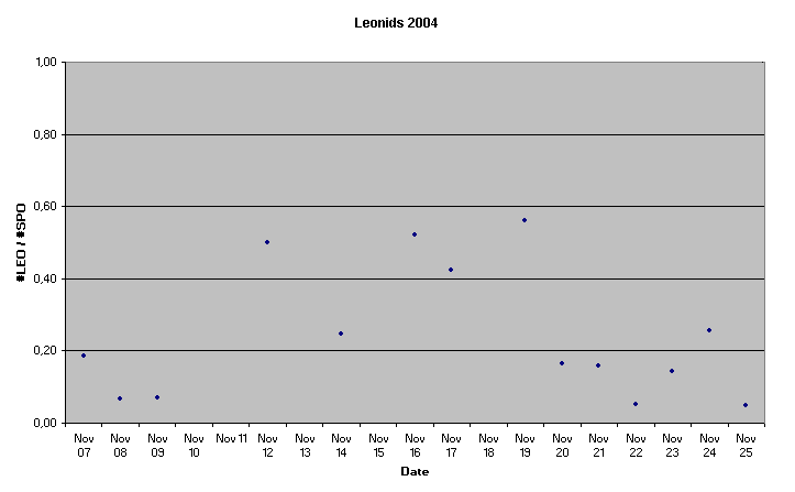 Results of the IMO Video Meteor Network - November 2004 ======================================================= November 2004 was a typical late autumn month with only rare clear skies. A stable high pressure system established over central Europe towards the end of the month, but it came with ground and high fog and prevented at many sites any observation until the second half of December. So it comes as no surprise, that nobody collected more than 16 observing nights. Even though the nights are long at this time of the year, only two observer logged more than a hundred hours of observing time. The Leonids are without doubt the most interesting meteor shower of November. Even though the times of meteor storms are over, there were a number of dust trails supposed to present zenithal rates of a few ten meteors per hour in 2004. Of special interest was the 1333 trail, which was predicted to cause Leonid activity well before the usual activity period on November 8/9. Beside the "regular" peak of the background component on the morning of November 17, two more maxima were predicted for the morning and evening of November 19 (but not in the European observing window). And what of all this could be found in the video data? To answer this question, I first selected all observations after midnight UT; times before midnight were ignored. Only after midnight, the Leonid radiant is high enough in the European night sky to produce noticable activity. Next the activity period of the Leonids was extended to all of November, and the meteor shower assignment of all observation was recomputed. Finally, all observations of a night were summarized, and the ratio between the number of Leonids and sporadic meteors was computed as an estimate of the meteor shower activity. The result is shown in the next figure, where only nights with at least ten sporadic meteors are displayed.Stane Slavec was the first to clearly detect Leonid activity as early as November 7/8 (5 LEO, 27 SPO), followed by a longer lull. On November 8/9, there was only one camera active in the morning, and it started after midnight UT such that the period of the 1333 dust trail could not be covered. On November 12/13 the activity increased clearly (14 LEO, 28 SPO). It briefly reduced in the follwing night (37 LEO, 149 SPO), but it stayed at the same high level (ratio of 1:2 between Leonids and sporadic meteors) between November 16/17 and 19/20. From November 20/21 to 24/25 there was still a clear sign of Leonid activity (9 LEO and 35 SPO in the last night), but after that the shower effectively vanished. Bottom line: None of the predicted dust trail could be identified, but it is still amazing over what a long period of time the Leonids are noticable in the video data. 1. Observers ============ Code Name Place Camera FOV LM Nights Time Meteors -------------------------------------------------------------------------------- BENOR Benitez-S. Maspalomas TIMES5 (0.8/6) 50 dg 3 mag 13 116.1 h 108 EVAST Evans Moreton RF1 (1.2/12) 20 dg 3 mag 2 18.0 h 86 KACJA Kac Kostanjevec METKA (0.8/8) 42 dg 2 mag 10 67.9 h 124 MOLSI Molau Seysdorf AVIS2 (1.4/50) 60 dg 6 mag 8 36.6 h 509 MINCAM1 (1.4/12) 35 dg 4 mag 15 73.7 h 93 SLAST Slavec Ljubljana KAYAK1 (1.8/28) 50 dg 4 mag 9 64.1 h 342 STRJO Strunk Leopoldshoehe MINCAM2 (0.8/8) 42 dg 4 mag 16 82.2 h 263 MINCAM3 (0.8/6) 55 dg 3 mag 10 60.3 h 258 UEBST Ueberschaer Aachen MIMO (0.95/25) 13 dg 4 mag 5 37.1 h 72 YRJIL Yrjola Kuusankoski FINEXCAM (0.8/6) 50 dg 3 mag 16 102.9 h 325 -------------------------------------------------------------------------------- Sum 29 658.9 h 2180 2. Observing Times (h) ====================== Nov 01 02 03 04 05 06 07 08 09 10 11 12 13 14 15 -------------------------------------------------------------------------------- BENOR - - - - - 7.0 11.3 6.5 - - - - 7.7 - - EVAST - - - 8.5 - - - - - - - 9.5 - - - KACJA - - - - - - - - - - - 3.1 - - - MOLSI - - - - - - - 0.7 - - - - - 10.8 2.7 - - - 2.8 0.8 0.8 - 2.9 4.4 - - - 1.0 12.6 5.2 SLAST - - - - - - 7.3 - 1.9 - - - - - - STRJO 0.8 - 2.0 5.2 5.7 5.6 2.8 9.2 - 2.7 9.3 0.6 - 9.4 - - - - - 3.2 5.6 2.5 10.3 - - 8.1 - - 6.4 - UEBST - - - - - - - 5.4 - - 6.3 - - - - YRJIL 9.5 6.1 1.6 - 1.0 - - - 3.5 - - - 2.1 6.4 9.4 -------------------------------------------------------------------------------- Sum 10.3 6.1 3.6 16.5 10.7 19.0 23.9 35.0 9.8 2.7 23.7 13.2 10.8 45.6 17.3 Nov 16 17 18 19 20 21 22 23 24 25 26 27 28 29 30 -------------------------------------------------------------------------------- BENOR 11.0 - - 11.5 9.4 11.8 11.8 3.8 8.1 - - - - 10.8 5.4 EVAST - - - - - - - - - - - - - - - KACJA 6.1 6.1 - 6.1 6.0 6.1 - - 6.1 6.0 10.7 11.6 - - - MOLSI - - - - 6.0 0.7 - 8.9 5.2 1.6 - - - - - - - - 2.8 3.5 3.4 - 11.7 13.5 7.6 - 0.7 - - - SLAST 5.7 3.6 - 9.7 11.3 11.2 5.8 0.8 6.8 - - - - - - STRJO - - - 1.3 1.2 - - 10.2 9.1 7.1 - - - - - - - - - - - - 11.7 10.0 2.5 - - - - - UEBST - - - - 8.3 - - 7.6 9.5 - - - - - - YRJIL 8.6 10.8 3.3 12.8 4.6 9.2 - - 0.9 13.1 - - - - - -------------------------------------------------------------------------------- Sum 31.4 20.5 3.3 44.2 50.3 42.4 17.6 54.7 69.2 37.9 10.7 12.3 - 10.8 5.4 3. Results (Meteors) ==================== Nov 01 02 03 04 05 06 07 08 09 10 11 12 13 14 15 -------------------------------------------------------------------------------- BENOR - - - - - 18 19 3 - - - - 3 - - EVAST - - - 16 - - - - - - - 70 - - - KACJA - - - - - - - - - - - 2 - - - MOLSI - - - - - - - 3 - - - - - 287 21 - - - 4 2 1 - 1 9 - - - 1 17 1 SLAST - - - - - - 54 - 4 - - - - - - STRJO 3 - 4 23 16 13 10 27 - 9 29 3 - 27 - - - - - 10 15 9 50 - - 30 - - 30 - UEBST - - - - - - - 17 - - 9 - - - - YRJIL 37 15 2 - 3 - - - 10 - - - 6 20 13 -------------------------------------------------------------------------------- Sum 40 15 6 43 31 47 92 101 23 9 68 75 10 381 35 Nov 16 17 18 19 20 21 22 23 24 25 26 27 28 29 30 -------------------------------------------------------------------------------- BENOR 3 - - 8 17 17 5 4 1 - 