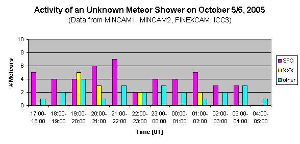 Results of the IMO Video Meteor Network - October 2005 ====================================================== Even though September was already the best month in the history of the camera network (some observations were reported after the deadline), we could significantly improve the result once more in October 2005. Let's have a look at the plain figures first: 12 observers recorded with 16 cameras in more than 1,500 hours effective observing time (best result so far: 1,140 hours in September 2005) almost 9,500 meteors (best "regular" result so far: 6,900 meteors in August 2003). That's even more than in November 2001 (8,900 meteors), when the data of the great Leonid storm in Asia an America added to the ordinary network observations. How could we achieve such phantastic numbers, even though the Orionids, the biggest shower of October, became a victim of the full moon? First of all we have to state the optimal weather in Germany. Both Joerg Strunk and Sirko Molau reported personal records with 248 and 188 observing hours for one camera, respectively. The weather was simply perfect, and if there had not been some fog in south Germany at some times, we would have recorded even 10,000 meteors. Secondly we must note, that Joerg Strunk operated under these optimal conditions (long clear nights) up to four (!) cameras in parallel. So he alone contributed 670 observing hours to the network - a result, that will hardly be beaten in the near future. A third aspect are the optimizations for Mintron cameras leading to more meteor records than in previous years. By now it has become possible to record up to a hundred meteors per night with a non-intensifed camera during the Taurids and Orionids. The best intensified cameras with 50mm tube recorded as much as 300 meteors a night, as was shown by AVIS2 and the Czech camera OND1. Last but not least, the number of observers is further growing. In October, Ulrich Sperberg has resumed observation with AKM1. The net outcome of all these factors is a results I would not have imagined before. Away from the plain figures, October still offered a number of highlights. The first was the outburst of an unknown meteor shower in the evening of October 5. Only a short time later Esko Lyytinen reported on IMO-News, that the Finish observer Jarmo Moilanen recorded 19 meteors on October 5, 11 of which originated from a sharp radiant at alpha=162 deg and delta=79 deg (not far from lambda Dra). On average, the meteors were quite bright, otherwise they would not have been recorded by a camera specialized on fireballs. At first I checked the data of AVIS2, which recorded 121 meteors that night. However, the unknown meteor shower was not prominent in these data. Things got more interesting when I had a look at the data of Mincam1 later on: Here the suspected radiant was clearly visible in the evening hours. The cameras of the other active observers (Ilkka Yrjola, Detlef Koschny, Joerg Strunk) showed this radiant also more or less clear. If all observations (without AVIS2) are taken together, we obtain the same sharp radiant as Jarmo with a geocentic velocity of 45 km/s. The following graph shows the number of sporadic meteors, meteors of the unknown shower (XXX) and other shower meteors (mainly Taurids) on October 5/6. It becomes clear that maximum activity occured between 19 and 21 UT. Since the shower was most obvious in non-intensified camera data, it must have a small r-value consisting almost only of bright meteors.Another highlight took place three days later in the European afternoon hours. Observers from Asia and Eastern Europe reported a Draconid ourburst with equivalent zenithal hourly rates up to 30 consisting mainly of faint meteors. Unfortunalety, the outburst was over in the European evening hours such that in the following night only a handful of Draconids were observed. Thanks to the early start of observation and it's high sensitivity, only the image- intensified camera in Ondrejov recorded a noticable number of Draconids belonging to the descending activity branch.