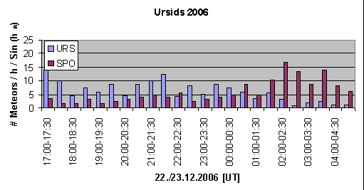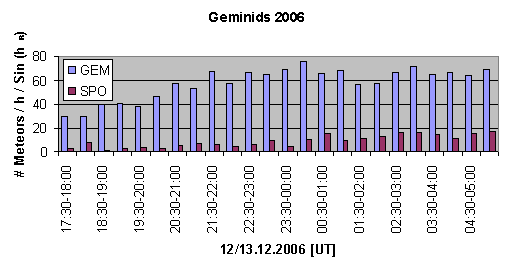 Results of the IMO Video Meteor Network - December 2006 ======================================================= Last month we could welcome another new observer in the IMO network. Biondani Roberto from Verona, who is trained by Flavio Castellani, is the fourth observer south of the Alps, which brings Italy up to second place with respect to the number of observers. In any case, December was a worthy finish of the most successful year in the history of the video network. Especially thanks to the Geminids, the records of October 2006 were almost broken. Observers in northern and western Europe were often displeased by the weather, but near the Alps the observers could enjoy high air pressure systems presenting clear skies, but sometimes also persistent fog. Just in time for the Geminids, skies cleared at many sites, so that one or the other observer was able to give their annual result a final kick. Since the Geminids are on average quite bright, there was only a small gap between intensified and non-intensified cameras this time. The best results were 609 (AVIS2) vs. 413 (MIN38) meteors in a single night. On December 13 alone, we collected more than 3500 meteor records - as many as only during the Leonid storms before. During the Ursids some days later, there were again a few sites with more than twelve hours of clear night skies. An overall of four observers managed to collect more than 20 observing nights in December, and with almost 1700 hours of effective observing time, last month ranked third behind October and September 2006. With more than 13500 meteors, we missed the October result by only a few hundred meteors. Thanks to the pleasant observing conditions it was possible to derive activity profiles for both the Geminids and Ursids. The following analysis is based on only those cameras with clear skies all night long (Geminids: AKM2, AVIS2, BMH1, FIAMENE, METKA, MIN38, MINCAM1 and SRAKA with 2218 GEM and 415 SPO altogether; Ursids: AKM2, AVIS2, BMH1, MIN38 and MINCAM1 with 151 URS and 267 SPO altogether). Meteor counts were summed in half hour intervals, corrected by the radiant altitude, and averaged between the cameras. The Geminids showed a significant increase of the corrected hourly rate in the evening hours of December 13 until about midnight. Highest activity occured in the 00:00-00:30 UT time interval. Thereafter the activity remained at a constantly high level until dawn. That agrees well with the rapid analysis of visual data at the IMO homepage showing highest rates between 00 and 01 UT as well. For the Ursids, there were predictions for enhanced rates at different times in the evening of December 22. Due to the lower meteor counts, the picture is less clear than for the Geminids. We observed highest rates right in the evening twilight (17:00-17:30 UT). After a short break, there was a second peak in the 21:30-22:00 time interval, and after that the rates went down systematically. By about 02 UT on December 23, the shower was almost gone. Thus, our video data confirm significantly enhanced activity in the evening hours of December 22, but we cannot confirm or disprove the predicted individual peak times. Time 13./14.12.2006 22./23.12.2006 [UT] GEM/h/sin(HR) SPO/h URS/h/sin(HR) SPO/h ------------------------------------------------------- 17:00-17:30 13.9 3.5 17:30-18:00 29.6 2.4 10.1 1.6 18:00-18:30 29.4 8.0 4.3 1.6 18:30-19:00 39.1 1.1 7.4 3.2 19:00-19:30 41.0 3.5 6.0 1.6 19:30-20:00 37.8 4.0 8.9 2.4 20:00-20:30 45.9 2.5 4.5 3.2 20:30-21:00 57.5 5.5 8.8 4.0 21:00-21:30 53.6 7.0 10.0 4.8 21:30-22:00 67.8 6.0 12.5 4.0 22:00-22:30 57.6 4.5 4.1 5.6 22:30-23:00 66.9 6.5 8.1 2.4 23:00-23:30 64.4 9.5 5.1 3.2 23:30-00:00 69.1 4.5 8.9 4.0 00:00-00:30 75.4 10.5 7.4 4.8 00:30-01:00 65.7 15.0 5.9 8.8 01:00-01:30 68.1 9.5 3.4 4.8 01:30-02:00 56.7 11.0 5.5 10.4 02:00-02:30 57.6 12.5 3.2 16.8 02:30-03:00 66.3 16.5 1.1 13.6 03:00-03:30 71.7 16.5 2.0 8.8 03:30-04:00 64.7 14.0 2.4 14.0 04:00-04:30 67.0 11.0 1.2 8.0 04:30-05:00 63.5 14.9 1.3 6.0 05:00-05:30 68.6 17.1 -------------------------------------------------------![]()