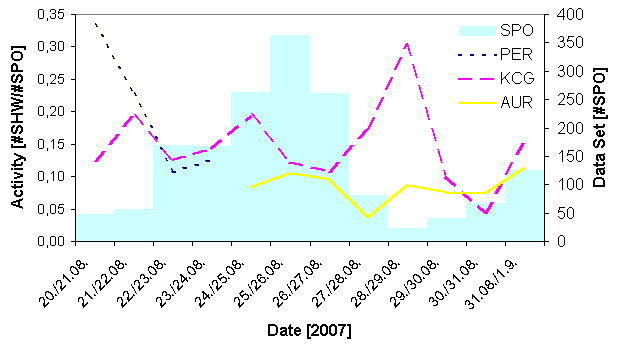 Results of the IMO Video Meteor Network - August 2007 ===================================================== Wouldn't it be time for a new record after the long dry period? But which ingredients are required to obtain more meteors that at any time before? - Many observers: One reason for the ongoing success of the IMO network is the steadily increasing number of observers. There is always some fluctuation, but in general the network is growing. In August 2007, 22 cameras were operated by 16 observers. We could even welcome two new observers: On the one hand there is Stefano Crivello (as you may guess from his name, Stefano is based in Italy), whose camera had first light last month. This would have been the first time with more Italian than German observers unless Niko Wuensche did some testing with the new meteor camera of Archenhold Observatory in Berlin. In these days, the camera will be finally installed at the observatory, and in the future it shall give the visitors a better insight into meteors and provide data to our network. By the way, at least with respect to the number of video camera the Germans still have the clear lead. ;-) Summary: This ingredient to a new record was not missing in August. - Active meteor showers: In principle you may expect new records only in August, October and December. Nobody will question August (Perdeids) and December (Geminids), but you may ask why October and not November (Leonids) or January (Quadrantids). The answer is simple - it's not only the meteor rate that counts, but also the length of the nights. The Perseids provide plenty of meteors for many nights, but the nights are quite short. October, on the other hand, presents almost half of the Perseid activity thanks to the Orionids, Taurids and sporadic activity, and the nights are almost twice as long. The time of the Leonids is over, and the activity interval of the Quadrantids is ways too short. Summary: Also this ingredient for a new record was present, not to forget that the Perseid maximum coincided with new moon in 2007. - Good weather: In the end, everything depends on the weather. The most splendid meteor shower is worth nothing if you only record "hydro meteors". In this respect, the last month was not perfect, but ok. Many observers collected more than 20 nights again, even if only few of these were perfectly clear. Just in time the weather cooperated with the observers: On August 12/13, 19 cameras were in operation (one of my automatic cameras failed just that night because of a power outage), and in the next night once more 15 cameras (here one of my camera failed because of a software bug - Murphys law!). Summary: Also the most important ingredient was present by August. So all things came together for a new highscore, and already by mid-August the meteor number grew over 10,000. By the end of the months we had collected nearly 14,000 meteors, which falls only slightly short of the so far best results (14,173 meteors in October 2006). However, 6 nights from REMO1 as well as the data of KAYAK1 and ICC3 are still missing, so I'm optimistic that in the end we may have even recorded close to 15,000 meteors! With more than 1,500 hours of effective observing time, August presented a respectable result, but in this category it cannot beat the autumn and winter months (2,225 hours in October 2006). Winner of the "beauty contest" last month were the Perseid plots from Biondani Roberto and Bob Lunsford. Both aimed their cameras almost directly at the radiant. Bobs camera had a smaller field of view, which is why his meteors were recorded closer to the radiant than Biondanis.![]()