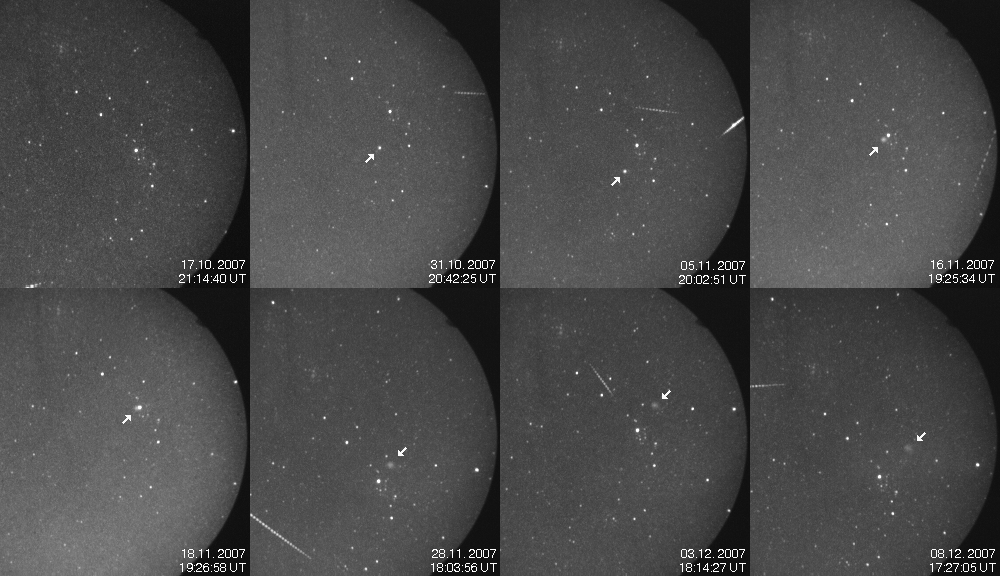 Results of the IMO Video Meteor Network - November 2007 ======================================================= Just like in October, the weather of last month was not particularly favourable. On the contrary: Whereas in the first half of the month at least the Italian observers enjoyed a number of clear nights, it was overcasted at all sites after the Leonid maximum. The weather was especially poor between November 21 and 25, such that on November 24 not a single meteor could be recorded in the camera network. Towards the end the weather improved slightly - this time mainly for the more northern observers. In summary, only two observers managed to collect more than 20 observing nights, and with 1500 hours and 6000 meteors, the total of November was mediocre, too. Last month we could welcome a new observer in the camera network, even though his first observation date back from June. With his 87 years, Milos Weber of the Czech Republic has become the by far oldest observer in the video network. Milos is especially interested in the June Lyrids, and so he decided to analyse this shower not only by means of visual observations, but also with a video camera. Milos is supported by his nephew Tomas Weber, who helped to install the hardware and software, and to analyse the video tapes. Milos applies a 50 mm lens, an image intensifier and a digital camcorder. Now the first four observations of June 2007 were analysed. Within four hours of observing time, 55 meteors were recorded. The highlight of November was not a meteor shower, but a typical source for meteors, a comet. On October 24, comet 17/P Holmes experienced a sheer incredible outburst increasing its brightness by 15 magnitudes. Typically this comet would be visible in large telescopes only, but after the outburst the constellation of Perseus all of a sudden showed a new "star" of third magnitude. In November, the coma of 17/P Holmes increased significantly and the comet became to the naked eye a blurred spot that moved through Perseus and faded slowly. Our meteor cameras are not particularly well suited for comet observations, but as the comet was bright enough and all night long placed high in the sky, it was recorded by a number of cameras. The best pictures were provided by Wolfgang Hinz with AKM2. This camera has not only a good limiting magnitude thanks to the image intensifier, but also a relatively small field of view of 30 degree, such that also the diffuse appearance became visible. The following picture shows the comet between October 17 (i.e. before the outburst) and December 8. Please, pay attention to the image of November 5, when two meteors appeared in parallel near the comet.1. Observers ============ Code Name Place Camera FOV LM Nights Time Meteors -------------------------------------------------------------------------------- BENOR Benitez-S. Las Palmas TIMES4 (1.4/50) 20 dg 3 mag 13 40.3 h 121 TIMES5 (0.95/50) 10 dg 3 mag 11 22.0 h 58 BRIBE Brinkmann Herne HERMINE (0.8/6) 55 dg 3 mag 19 59.4 h 291 CASFL Castellani Monte Baldo BMH1 (0.8/6) 55 dg 3 mag 22 166.0 h 428 CRIST Crivello Valbrevenna STG38 (0.8/3.8) 80 dg 3 mag 4 36.4 h 200 ELTMA Eltri Venezia MET38 (0.8/3.8) 80 dg 3 mag 7 79.7 h 358 EVAST Evans Moreton RF1 (0.8/12) 25 dg 5 mag 10 76.5 h 375 HINWO Hinz Brannenburg AKM2 (0.85/25) 32 dg 6 mag 11 73.7 h 473 KACJA Kac Kostanjevec METKA (0.8/8) 42 dg 4 mag 14 107.0 h 462 Kamnik REZIKA (0.8/6) 55 dg 3 mag 17 86.3 h 385 Ljubljana ORION1 (0.8/8) 42 dg 4 mag 12 66.6 h 402 LUNRO Lunsford Chula Vista BOCAM (1.4/50) 60 dg 6 mag 5 32.7 h 382 MOLSI Molau Seysdorf AVIS2 (1.4/50) 60 dg 6 mag 6 33.2 h 219 MINCAM1 (0.8/6) 55 dg 3 mag 17 66.1 h 229 ROBBI Roberto Verona FIAMENE (0.8/3.8) 80 dg 3 mag 21 152.5 h 511 SLAST Slavec Ljubljana KAYAK1 (1.8/28) 50 dg 4 mag 14 75.6 h 192 STOEN Stomeo Scorze MIN38 (0.8/3.8) 80 dg 3 mag 13 111.7 h 573 STORO Stork Ondrejov OND1 (1.4/50) 55 dg 6 mag 1 2.7 h 67 STRJO Strunk Herford MINCAM2 (0.8/6) 55 dg 3 mag 12 12.3 h 37 MINCAM3 (0.8/8) 42 dg 4 mag 1 1.9 h 8 TRIMI Triglav Velenje SRAKA (0.8/6) 55 dg 3 mag 19 109.1 h 399 YRJIL Yrjola Kuusankoski FINEXCAM (0.8/6) 55 dg 3 mag 7 43.8 h 210 -------------------------------------------------------------------------------- Sum 29 1455.5 h 5979 2. Observing Times (h) ====================== Nov 01 02 03 04 05 06 07 08 09 10 11 12 13 14 15 -------------------------------------------------------------------------------- BENOR - 2.3 4.2 2.8 3.1 2.8 - - - - 0.3 - 0.9 0.1 - - 0.9 2.3 1.5 0.9 - - - - - 2.6 0.3 - - - BRIBE - - 1.5 - 5.0 0.3 4.5 - - - 7.0 3.5 0.5 - 1.5 CASFL 11.5 10.1 12.1 11.2 - 12.3 8.8 2.3 12.4 10.6 9.2 - 1.0 3.7 6.6 CRIST - 6.8 10.9 - - - - - - 9.1 - - - - - ELTMA 11.2 - 11.6 - - 9.2 - - 11.0 - - 12.1 - - 12.2 EVAST 7.4 7.4 6.8 - 7.7 - - 4.4 - - 8.7 - 9.4 10.3 10.7 HINWO 11.7 6.1 - - 7.4 - - - - - - - - - - KACJA 10.5 4.6 9.2 4.6 6.0 - - - 8.5 1.8 - 10.2 - - 1.3 12.2 8.2 5.0 2.5 5.4 3.1 0.9 - - - 4.1 12.1 - 0.8 9.3 7.4 4.6 6.6 - 1.8 - - 1.3 8.9 1.9 - 3.4 - - 4.4 LUNRO - - - - - - - - - - 3.4 - 10.7 11.0 3.3 MOLSI - - - - 5.8 - - - - - - - - - 5.5 10.6 - - 0.2 6.0 2.1 - - - 1.8 3.8 - - 0.3 8.0 ROBBI - 11.0 10.0 9.1 - 10.1 7.1 1.1 9.2 9.2 6.2 10.7 - 4.3 8.8 SLAST 8.8 7.4 4.0 - 2.2 4.8 7.7 1.8 8.3 3.0 1.8 11.9 2.2 - 9.2 STOEN 10.7 11.3 12.0 - - 12.3 - 3.7 11.2 - 1.4 11.4 - 4.8 11.9 STORO - - - - - - - - - - - - - - - STRJO - - - - 1.0 - - - - - 1.0 - 1.3 0.8 0.5 - - - - - - - - - - - - - - - TRIMI 12.8 3.1 6.8 0.5 4.5 7.3 4.0 2.0 7.3 2.2 1.5 9.7 - - 3.7 YRJIL 2.7 8.6 2.5 12.6 - - - - - - - - - - - -------------------------------------------------------------------------------- Sum 117.5 92.4105.5 45.0 56.8 64.3 33.0 16.6 76.8 39.6 51.0 85.3 26.0 36.1 96.9 Nov 16 17 18 19 20 21 22 23 24 25 26 27 28 29 30 -------------------------------------------------------------------------------- BENOR 6.9 4.1 6.4 1.0 5.4 - - - - - - - - - - 4.2 0.8 3.3 0.2 5.0 - - - - - - - - - - BRIBE 2.8 3.3 8.5 - 1.5 7.3 - 0.3 - 0.9 0.6 2.3 2.8 5.3 - CASFL 11.1 6.7 5.7