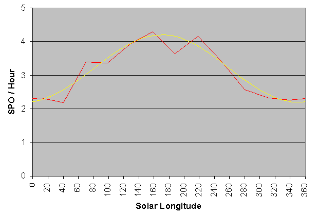 Figure 2: Annual variation of the average number of sporadic meteors per hour (red – original values; yellow – Sine fit) 1. Observers ============ Code Name Place Camera FOV LM Nights Time Meteors -------------------------------------------------------------------------------- BENOR Benitez-S. Las Palmas TIMES4 (1.4/50) 20 dg 3 mag 6 11.0 h 23 TIMES5 (0.95/50) 10 dg 3 mag 7 7.3 h 21 BRIBE Brinkmann Herne HERMINE (0.8/6) 55 dg 3 mag 24 76.0 h 167 CASFL Castellani Monte Baldo BMH1 (0.8/6) 55 dg 3 mag 13 62.7 h 107 BMH2 (0.8/6) 55 dg 3 mag 9 39.6 h 49 CRIST Crivello Valbrevenna STG38 (0.8/3.8) 80 dg 3 mag 3 14.6 h 29 GONRU Goncalves Tomar TEMPLAR1(0.8/3.8) 80 dg 3 mag 8 64.7 h 95 HERCA Hergenroth. Tucson SALSA (1.2/4) 80 dg 3 mag 29 221.4 h 305 HINWO Hinz Brannenburg AKM2 (0.85/25) 32 dg 6 mag 12 66.4 h 140 KACJA Kac Kostanjevec METKA (0.8/8) 42 dg 4 mag 15 71.4 h 131 Kamnik REZIKA (0.8/6) 55 dg 3 mag 7 36.2 h 35 Ljubljana ORION1 (0.8/8) 42 dg 4 mag 19 72.6 h 99 KOSDE Koschny Noordwijkerh. ICC4 (0.85/25) 25 dg 5 mag 10 46.3 h 76 LUNRO Lunsford Chula Vista BOCAM (1.4/50) 60 dg 6 mag 15 92.4 h 251 MOLSI Molau Seysdorf AVIS2 (1.4/50) 60 dg 6 mag 8 44.2 h 375 MINCAM1 (0.8/6) 55 dg 3 mag 15 48.4 h 74 Ketzuer REMO1 (0.8/3.8) 80 dg 3 mag 20 72.7 h 160 REMO2 (0.8/3.8) 80 dg 3 mag 12 47.4 h 163 PRZDA Przewozny Berlin ARMEFA (0.8/6) 55 dg 3 mag 3 18.0 h 51 ROBBI Roberto Verona FIAMENE (0.8/3.8) 80 dg 3 mag 12 44.9 h 81 SLAST Slavec Ljubljana KAYAK1 (1.8/28) 50 dg 4 mag 13 49.8 h 77 STOEN Stomeo Scorze MIN38 (0.8/3.8) 80 dg 3 mag 10 58.9 h 120 STORO Stork Kunzak KUN1 (1.4/50) 55 dg 6 mag 1 8.3 h 25 Ondrejov OND1 (1.4/50) 55 dg 6 mag 3 9.8 h 51 STRJO Strunk Herford MINCAM2 (0.8/6) 55 dg 3 mag 23 39.8 h 80 MINCAM3 (0.8/8) 42 dg 4 mag 9 20.5 h 50 MINCAM5 (0.8/6) 55 dg 3 mag 9 29.3 h 67 YRJIL Yrjola Kuusankoski FINEXCAM (0.8/6) 55 dg 3 mag 21 96.0 h 158 -------------------------------------------------------------------------------- Sum 30 1470.6 h 3060 2. Observing Times (h) ====================== Apr 01 02 03 04 05 06 07 08 09 10 11 12 13 14 15 -------------------------------------------------------------------------------- BENOR - - - - - - 2.0 2.7 3.4 - - - - - - - - - - - - 3.2 0.3 3.8 - - - - - - BRIBE 0.3 - - - - 7.0 4.5 1.7 3.7 2.0 5.1 1.8 0.3 2.0 3.3 CASFL 0.5 - 9.3 6.2 3.1 - 2.0 - - 1.0 - - - - - 3.4 6.3 6.9 4.2 5.1 - 6.5 - - - - - - - - CRIST - - - - 5.8 - - - - - - - - - - GONRU 9.7 9.6 9.6 9.5 - 1.5 - - - - 8.4 - - - - HERCA 7.2 7.8 8.3 3.2 9.7 9.7 9.6 9.6 6.9 9.5 9.5 9.4 9.4 - - HINWO - - - - - - 8.4 0.9 - 0.9 - 2.5 8.0 - 9.3 KACJA 1.3 4.6 - - 8.8 3.5 - - - - - - - - - 4.2 - 1.4 5.4 7.3 - - 6.0 - 6.0 - - - - - 2.8 - 5.1 7.1 6.1 - 1.8 - - - - - 0.6 8.2 2.8 KOSDE - 2.3 - - - - - 8.2 7.9 - 6.8 3.3 - - - LUNRO 4.8 8.5 - - - - - - - 3.9 - 8.3 9.0 4.5 - MOLSI - - - - - - 6.0 - - - - - 7.9 - - - - - 0.2 0.3 - 9.0 - - 0.3 - - 8.6 - 0.7 1.0 - 0.9 2.3 - 6.2 1.6 5.5 - - - - 0.7 - - 0.5 - - - - - - - - - - - 1.5 - - PRZDA - - - 6.7 - - - - - - - - - - - ROBBI 2.5 5.2 7.5 - - - 5.0 3.1 - - 1.8 - - - - SLAST 0.7 - - 7.2 3.4 - - - - - - - 1.4 6.0 5.0 STOEN 1.2 8.2 - - 9.0 - 7.0 - - - - - 5.5 - - STORO - - - - - - 8.3 - - - - - - - - - - - - - 0.8 7.7 1.3 - - - - - - - STRJO 1.0 - - 1.5 2.7 1.0 0.5 - 0.5 - 2.0 1.0 - 1.7 1.5 - - - - - - - - - - - 1.0 - - - - - - - - - - - - - - 4.0 - - - YRJIL 7.5 6.6 6.3 7.1 - - - - 1.4 6.2 0.7 - - 5.7 1.0 -------------------------------------------------------------------------------- Sum 48.6 59.1 55.3 60.6 61.3 29.7 83.1 39.3 27.6 29.8 34.3 31.3 52.9 28.1 23.6 Apr 16 17 18 19 20 21 22 23 24 25 26 27 28 29 30 -------------------------------------------------------------------------------- BENOR - - - - - 2.5 - - - - - 0.2 0.2 - - - - - - - - - - - - - - - - - BRIBE 6.3 6.2 2.9 - 6.0 8.4 2.3 - 0.7 1.0 3.8 2.3 0.3 1.4 2.7 CASFL - - - 6.4 - - 8.1 4.1 8.0 6.3 1.9 5.8 - - - - - - 0.7 0.5 - 6.0 - - - - - - - - CRIST - - - 1.0 - - - - - 7.8 - - - - - GONRU - - - - - - - - - - - - 8.3 - 8.1 HERCA 7.6 3.3 6.1 9.2 7.2 9.1 7.7 9.1 8.9 9.0 3.0 8.9 8.9 7.8 5.8 HINWO - 3.3 - 7.0 5.5 - - 2.3 - - 4.2 7.1 - 7.0 - KACJA - 1.8 - 5.2 - 3.5 3.3 4.7 2.3 3.4 7.6 7.9 7.8 - 5.7 - - - - - - - - 5.9 - - - - - - - - - 6.4 1.2 3.3 1.2 5.0 3.2 2.9 5.2 7.1 2.0 0.6 - KOSDE - - - - - 2.6 - - 5.0 - 1.5 - - 2.3 6.4 LUNRO - 2.0 8.7 1.0 - - 5.9 - - 8.2 8.1 7.9 4.2 7.4 - MOLSI - - - - 3.4 - - 5.9 2.3 - 7.0 4.9 - 6.8 - - 2.4 - 3.2 5.2 - - 1.0 0.6 2.8 3.8 2.7 - 7.6 - - - 2.6 2.1 4.0 5.5 7.4 7.4 2.8 7.3 7.1 4.1 1.0 0.4 2.8 - - - - 6.1 6.0 6.0 6.5 1.7 4.3 5.8 6.0 - 1.1 1.9 PRZDA - - - - - - - 6.9 4.4 - - - - - - ROBBI - - - - - - 2.0 1.1 5.1 6.0 - 3.9 - - 1.7 SLAST - - - 2.1 - - - 4.7 3.1 3.2 5.1 6.5 - - 1.4 STOEN - - - 7.4 4.2 - - - 7.9 - 2.4 6.1 - - - STORO - - - - - - - - - - - - - - - - - - - - - - - - - - - - - - STRJO 2.1 0.5 0.9 0.5 4.5 4.7 1.0 1.1 - 1.0 1.3 1.5 - 5.0 2.3 1.7 - 1.0 - 3.5 - 5.4 1.0 - - 2.3 1.0 - 3.6 - 4.7 - 1.7 - 4.8 - 2.5 1.0 - - 4.0 2.7 - 3.9 - YRJIL 2.8 - 3.9 5.3 5.2 3.8 4.9 4.2 4.6 3.7 2.6 - - 3.8 8.7 -------------------------------------------------------------------------------- Sum 25.2 19.5 27.8 57.5 61.3 49.4 63.7 66.0 66.5 66.9 76.7 86.6 32.7 58.7 47.5 3. Results (Meteors) ==================== Apr 01 02 03 04 05 06 07 08 09 10 11 12 13 14 15 -------------------------------------------------------------------------------- BENOR - - - - - - 4 5 6 - - - - - - - - - - - - 10 2 9 - - - - - - BRIBE 1 - - - - 11 10 2 8 5 14 3 1 7 5 CASFL 1 - 16 9 7 - 2 - - 2 - - - - - 3 7 12 3 4 - 7 - - - - - - - - CRIST - - - - 11 - - - - - - - - - - GONRU 17 11 13 12 - 1 - - - - 11 - - - - HERCA 10 5 11 4 14 16 9 8 3 12 10 10 9 - 7 HINWO - - - - - - 19 2 - 7 - 5 26 - - KACJA 1 13 - - 14 5 - - - - - - - - - 3 - 2 7 8 - - 5 - 5 - - - - - 2 - 6 11 6 - 2 - - - - - 1 12 5 KOSDE - 5 - - - - - 7 11 - 11 7 - - - LUNRO 7 12 - - - - - - - 10 - 30 30 20 - MOLSI - - - - - - 75 - - - - - 92 - - - - - 1 1 - 9 - - 2 - - 13 - 2 2 - 2 3 - 7 6 4 - - - - 1 - - 1 - - - - - - - - - - - 2 - - PRZDA - - - 12 - - - - - - 