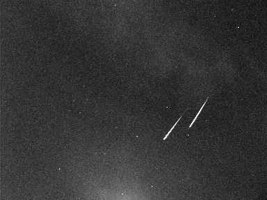 Figure 2: Double Capricornid, recorded by Stefano Crivello with STG38 on July 27, 01:55 UT. Beside archiving the July data also the next full analysis of the video meteor database was prepared in the last few days. In particular the scatter respectively observing errors of video meteors with respect to position and angular velocity was of interest. As explained before, the meteor shower analysis relies on the accumulation of probabilities, that meteors origin from a particular radiant with given position and velocity. That probability is derived from two quantities - the distance at which the backward prolongation of the meteor misses the (point-like) radiant, and the difference between the observed and the expected angular velocity. The latter one is calculated from the distance of the meteor from the radiant, and the meteor shower velocity. Those who have used the Radiant software of Rainer Arlt know the phenomenon: With the parameter "Standard Deviation" you can adjust whether the probability distribution of a meteor in probability mode becomes a small droplet (small scatter, the radiation area can be well defined) or a large area (large scatter, the radiant can be determined only approximately). You need to adjust the settings by trial and error: When the standard deviation is set too small, random sub-radiants will show up, whereas a meteor shower radiant becomes blurred, when the standard deviation is set too large. In the 2006 analysis I had chosen both for the scatter in angular velocity and radiant distance a normal (Gaussian) distribution. The standard deviation was set empirically to a "sensible" value. This time, the standard deviation was to be computed from data. For this reason, short intervals in solar longitude at the maximum times of the Perseids, Orionids, and Geminids were chosen, in which the radiant was compact and showed only little drift. Then all shower members in these solar longitude intervals were determined (more than 33,000 meteors overall) and the distributions were computed, how the angular meteor velocity differed from the expected value and how far the backward prolongation missed the radiant. In addition, the dependency of these distributions from the angular velocity of the meteor and its distance from the radiant was analysed. Here is a summary of the results: * On average, the scatter is lower than expected. The observed angular velocity of half of all meteors deviates less than half a degree per second from the expected value (whereby the underlying PosDat database contains only integer values for the velocity, anyway), and the backward prolongation missed the radiant by less than three quarter of a degree. At one sigma (68.3%) the deviation is 0.8 deg/s and 1.3 deg. * Ihe distributions are not Gaussian as expected, but can be well described by a Laplace distribution (i.e. a function of the type e^-x instead of e^-x*x). The main difference is, that for large values the Laplace function converges much slower to zero than the Gauss function. * There is a clear dependency between the scatter in angular velocity and the meteor velocity (the faster the meteors, the large the scatter - the scatter for meteors that move faster than 30 deg/s is about twice as large as for meteors slower than 10 deg/s). On the other hand, the scatter of the radiant miss distance of the backward prolongations is essentially independent from the distance of the meteor from the radiant. The IMO handbook for meteor observers, by the way, suggests that in the analysis of visual observation larger errors should be accepted both for the angular velocity and the radiant miss distance for meteors that are fast or far away from the radiant. Figure 3 and 4 show the cumulative distributions for those 33,000 Perseids, Orionids and Geminids.