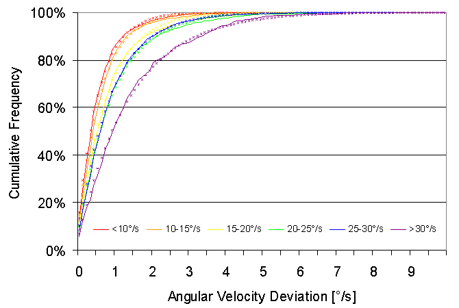 Figure 3: Cumulative distribution of velocity errors for different angular velocities of meteors. Small crosses mark the corresponding Laplace fits.