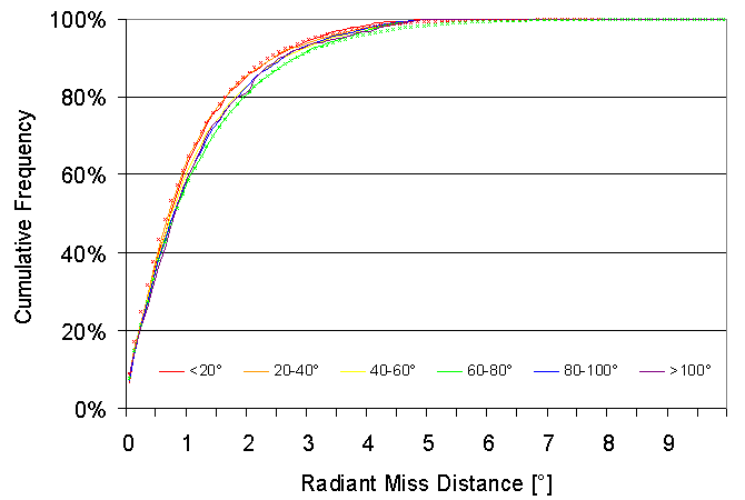 Figure 4: Cumulative distribution of radiant miss distances for different distances of the meteor from the radiant. Small crosses mark an lower and upper Laplace fit. Ironially, when I carried out the meteor database analysis for the first time before the AKM spring meeting 2006, I accidentally used a Laplace distribution. Later I noticed this "error" and used a normal distribution for the analysis later presented at the 2006 IMC - as one usually does if the true probability distribution is unknown. Now it turns out that the Laplace distribution would have been better. The influence of the distribution is not as dramatic, however, that we may expect completely different results now. At least the next analysis will not be done with empirically set parameters, but with a probability distribution derived from data, so from the point of view of probability theory everything is fine. Strictly speaking, the distributions models only the scatter for compact radiants. If the radiation area is of bigger size, the distribution should be wider as well - but that's a different topic. 1. Observers ============ Code Name Place Camera FOV LM Nights Time Meteors -------------------------------------------------------------------------------- BENOR Benitez-S. Las Palmas TIMES4 (1.4/50) 20 dg 3 mag 5 33.5 h 93 TIMES5 (0.95/50) 10 dg 3 mag 5 18.4 h 34 BRIBE Brinkmann Herne HERMINE (0.8/6) 55 dg 3 mag 23 75.6 h 252 CASFL Castellani Monte Baldo BMH1 (0.8/6) 55 dg 3 mag 21 88.9 h 278 BMH2 (0.8/6) 55 dg 3 mag 27 95.4 h 261 CRIST Crivello Valbrevenna STG38 (0.8/3.8) 80 dg 3 mag 4 14.9 h 64 ELTMA Eltri Venezia MET38 (0.8/3.8) 80 dg 3 mag 3 19.7 h 123 GONRU Goncalves Tomar TEMPLAR1(0.8/3.8) 80 dg 3 mag 27 161.1 h 451 HERCA Hergenroth. Tucson SALSA (1.2/4) 80 dg 3 mag 15 73.0 h 229 HINWO Hinz Brannenburg AKM2 (0.85/25) 32 dg 6 mag 11 41.1 h 206 KACJA Kac Kostanjevec METKA (0.8/8) 42 dg 4 mag 11 64.2 h 187 Kamnik REZIKA (0.8/6) 55 dg 3 mag 8 38.5 h 165 Ljubljana ORION1 (0.8/8) 42 dg 4 mag 23 103.9 h 297 LUNRO Lunsford Chula Vista BOCAM (1.4/50) 60 dg 6 mag 22 89.5 h 1031 MOLSI Molau Seysdorf AVIS2 (1.4/50) 60 dg 6 mag 13 55.9 h 955 MINCAM1 (0.8/6) 55 dg 3 mag 19 84.9 h 273 Ketzuer REMO1 (0.8/3.8) 80 dg 3 mag 24 91.5 h 412 REMO2 (0.8/3.8) 80 dg 3 mag 24 88.5 h 439 PRZDA Przewozny Berlin ARMEFA (0.8/6) 55 dg 3 mag 14 69.5 h 428 SLAST Slavec Ljubljana KAYAK1 (1.8/28) 50 dg 4 mag 20 78.4 h 154 STOEN Stomeo Scorze MIN38 (0.8/3.8) 80 dg 3 mag 13 73.9 h 291 STORO Stork Kunzak KUN1 (1.4/50) 55 dg 6 mag 2 11.5 h 253 Ondrejov OND1 (1.4/50) 55 dg 6 mag 4 21.3 h 693 STRJO Strunk Herford MINCAM2 (0.8/6) 55 dg 3 mag 14 32.8 h 86 MINCAM3 (0.8/8) 42 dg 4 mag 5 19.2 h 66 MINCAM5 (0.8/6) 55 dg 3 mag 11 34.9 h 113 WEBMI Weber Chouzava TOMIL (1.4/50) 50 dg 6 mag 6 10.9 h 237 YRJIL Yrjola Kuusankoski FINEXCAM (0.8/6) 55 dg 3 mag 1 1.8 h 7 -------------------------------------------------------------------------------- Sum 31 1592.7 h 8078 2. Observing Times (h) ====================== July 01 02 03 04 05 06 07 08 09 10 11 12 13 14 15 -------------------------------------------------------------------------------- BENOR - - - - - - - - - - - - - - - - - - - - - - - - - - - - - - BRIBE 5.9 - 0.3 6.0 - 2.8 0.3 0.8 - - - 1.0 5.0 6.3 0.8 CASFL 6.0 2.5 4.0 6.0 - - 4.1 - 5.2 4.7 0.7 3.2 2.8 3.8 6.4 6.0 1.1 3.5 1.2 - 0.8 1.6 1.6 5.2 0.5 0.5 2.0 2.8 4.5 6.4 CRIST - - - - 2.7 - - - - - - - - - 6.3 ELTMA - - - - - - - - - - - - - - - GONRU 0.8 7.3 7.2 - 7.3 7.4 7.4 7.4 3.4 1.0 1.9 6.3 7.4 7.2 7.5 HERCA - - - - - - - 2.0 - - - - - - 3.2 HINWO 4.4 4.8 - 4.9 2.3 - - 2.0 - 2.1 - - - - 5.4 KACJA 6.1 - 1.7 - 4.0 - - - - 6.6 4.2 6.2 - - - 5.6 6.2 0.5 - 5.9 - - 6.3 - 4.7 - 3.8 - - - 6.3 3.3 3.2 - 6.3 - - 2.9 5.5 6.5 6.6 3.6 - 3.7 5.7 LUNRO 2.6 3.0 - 7.5 - - - - - 3.0 1.0 6.0 7.7 2.7 5.8 MOLSI 4.5 - - 3.7 3.1 - 4.9 - - 4.9 - - - - 4.5 5.7 1.8 - 5.7 3.7 - 5.8 5.9 - 4.9 - - - 1.2 6.1 4.4 4.5 - - 4.5 - 4.7 0.7 3.2 - 0.3 3.9 5.0 1.0 - 4.4 4.5 - - 4.6 0.6 3.1 0.7 4.7 - 0.7 2.3 4.9 2.5 - PRZDA - - - - - - - - 4.8 - - 3.4 5.0 - - SLAST 4.8 2.0 0.3 - 4.6 - 2.0 3.7 4.0 5.8 5.2 - - - 5.0 STOEN 5.5 - - 5.7 - - 5.1 6.1 5.8 5.6 - - - - 6.2 STORO - - - - - - - - - - - - - - - - - - - - - - - - - - - - - - STRJO 3.4 3.0 - 0.5 - 2.5 0.5 - - - 0.6 1.4 4.3 3.4 - 3.7 - - - - - - - - - - - - - - 2.1 - - 1.0 - - - - - - - 0.5 - - - WEBMI - 1.9 - - 2.0 - 1.9 - - - - - - - - YRJIL - - - - - - - - - - - - - - - -------------------------------------------------------------------------------- Sum 82.2 45.9 20.7 42.2 51.0 14.1 41.4 40.1 41.8 50.3 21.7 43.6 44.9 36.3 69.3 July 16 17 18 19 20 21 22 23 24 25 26 27 28 29 30 31 ------------------------------------------------------------------------------------- BENOR - - - - - - - - - - 6.5 7.0 3.8 8.1 8.1 - - - - - - - - - - - 1.5 3.8 6.6 2.5 4.0 - BRIBE 2.0 - - 4.4 2.8 1.6 3.9 6.6 5.7 - 0.8 4.7 6.8 0.8 2.0 4.3 CASFL 2.2 - - 4.4 - - 5.7 6.7 6.7 3.3 - - - 3.8 2.5 4.2 4.6 - 1.0 6.5 - - 6.7 6.7 3.2 6.8 1.0 6.9 5.9 3.2 2.0 3.2 CRIST - - - 1.1 - - - - - - 4.8 - - - - - ELTMA - - - - - - - - - - - 6.9 5.6 - - 7.2 GONRU 7.4 7.5 1.2 - 6.0 5.2 5.2 7.1 4.1 - 7.7 - 7.6 7.9 6.7 8.0 HERCA 6.3 4.0 3.1 - - 5.1 5.1 0.5 4.5 4.3 - 2.5 7.6 7.9 8.4 8.5 HINWO - - - - - - - - - 1.5 - 6.0 - 1.4 - 6.3 KACJA - - - 6.8 - - - - - - - 6.9 7.3 - 7.0 7.4 5.5 - - - - - - - - - - - - - - - 6.7 - 0.9 6.8 - - 3.5 2.1 3.1 4.1 - 7.2 7.2 4.3 1.6 2.8 LUNRO 1.7 5.9 - - 1.0 8.0 2.0 2.6 2.3 7.9 4.0 - 3.6 3.3 4.0 3.9 MOLSI - - - - - - - 5.0 - 4.8 - 5.8 5.7 3.5 0.3 5.2 - - 0.7 - 0.8 - - 6.5 0.5 6.6 - 6.7 6.8 6.7 3.1 5.7 3.6 - 0.7 2.7 1.8 - 3.9 5.5 1.1 5.6 5.7 5.8 5.9 4.9 6.0 6.1 3.6 - 1.6 0.3 1.8 - 4.5 5.5 - 4.7 5.7 5.8 5.9 4.0 6.0 6.1 PRZDA - - - 3.1 - - 5.5 5.6 0.7 5.7 5.8 5.8 5.9 6.0 6.1 6.1 SLAST 5.3 - 1.0 3.4 - - - 2.8 3.1 4.9 - 4.8 5.6 5.1 5.0 - STOEN - - - - - - - 5.4 6.6 - - 6.7 6.8 - 1.5 6.9 STORO - - - - - - - - - - - - 6.8 4.7 - - - - - - - - - - - - - - 5.9 3.6 6.2 5.6 STRJO 4.5 - - 1.4 0.5 - 1.7 - - - - - - - 5.1 - - - - - - - - - 0.5 - - - 4.1 - 5.3 5.6 - - - - - 