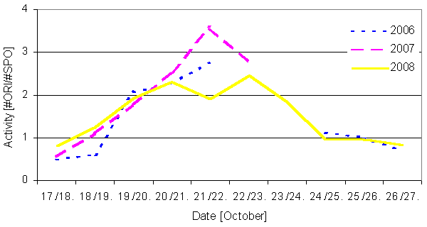 Figure 2: Comparison of the activity profiles (only maximum times) of the Orionids in the years 2006 till 2008. When comparing the long-term activity profiles from visual and video data (figure 3) one should note, that the visual profile is based only on data from the "normal" years until 2005, whereas most of the video data were obtained in 2006 and 2007. Until October 18, both profiles agree well. Thereafter the activity from the peak years 2006 and 2007 is dominating. It's interesting to see, that the surplus in activity holds not only for the Orionid maximum, but for the whole descending activity branch until the end of the visual observing period.