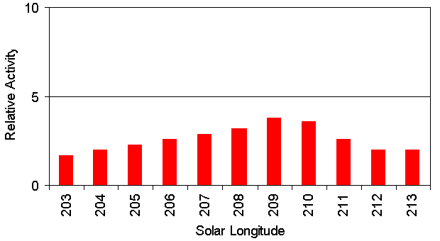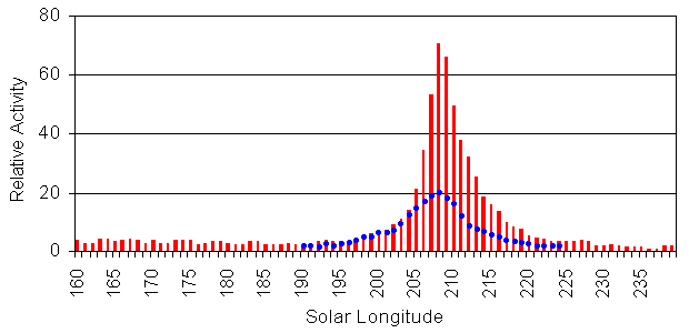 Figure 3: Long-term activity profile of the Orionids. The blue dots correspond to the ZHR profile from the current edition of the IMO handbook (without the years 2006 and 2007). Whereas in the old IMO handbook a number of ecliptical sources where listed as individual meteor showers, they were combined to the Antihelion source in the last revision of the meteor shower list. The only exception are the northern and southern Taurids between September 25 and November 25, which are still listed as independent showers. In our video data, the northern Taurids are clearly identified between October 20 and November 29, i.e. the radiant position shows only little scatter in that time interval and fits well to the position given in the IMO handbook. In total, the radiant could be traced with 4,500 shower members between October 1 and December 11, but there is significant scatter in the individual positions of the first and last few days (figure 4).