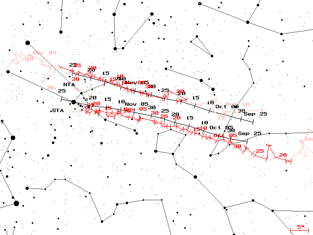 Figure 4: Radiant position of the northern and southern Taurids from data of the IMO Video Meteor Database. The activity interval of the southern Taurids starts a little earlier. In our video data, they are identified with a total of 6,800 shower members between September 8 and November 30. The radiant is well-defined between September 18 and November 26, where it lies constantly about one or two degrees south of the position given in the IMO handbook. According to the IMO handbook, the activity of the northern and the southern branch varies, whereby activity of the southern Taurids ends a week earlier. The activity profile obtained in the 2008 analysis of the video meteor database (figure 5) draws a more accurate picture. Both showers have a clear activity profile of their own. At first, the southern Taurids (blue) dominate. They reach their maximum around October 12 and loose strength thereafter, whereas the activity of the northern Taurids (red) is increasing in parallel. In early November, both branches are of about the same strength, and then the northern Taurids with their maximum around November 11 dominate. The breakdown in activity near solar longitude 236 is not real but an artefact from the Leonids.