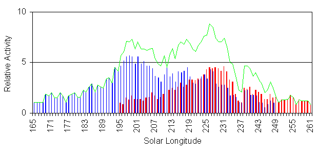 Figure 5: Activity profile of the northern (red) and southern (blue) Taurids. The green line is the resulting total activity from both branches. In the last few days there have been hints, that the fraction of bright Taurids and fireballs early November 2008 was higher than usual. A preliminary analysis of visual data, however, revealed the same population index as in the years before. Here I tried for the first time to analyse the brightness data of video meteors. The average brightness of all Taurids and sporadic meteors from one night was computed and subtracted from each other. Figure 6 shows the development of the brightness difference for the years 2006 till 2008, averaged in a sliding 3-day interval. On average, the Taurids were 0.2 mag fainter than the sporadic meteors. That value shows some scatter from one night to the next, but there is no indication that the 2008 Taurids were brighter than in previous years. Only towards the end of the month such a deviation may be suggested. In remains to see whether this trend continues in November.