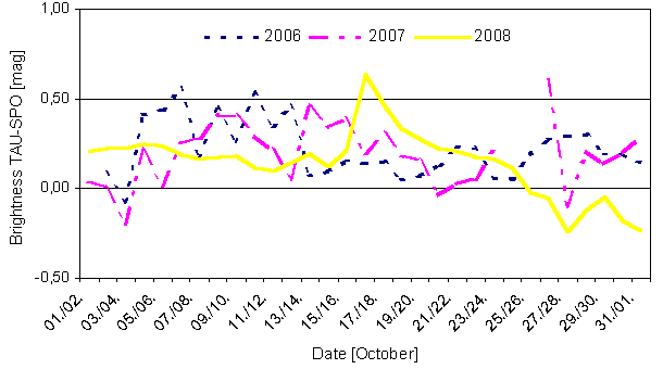 Figure 6: Mean brightness difference between the Taurids and sporadic meteors in the years 2006 till 2008. Lets have a brief look at the Leo-Minorids in the end. As mentioned before, this shower has been included in the IMO working list in the last revision, after among others also our video data confirmed their existence. The handbook lists an activity interval from October 19 till 27 with a maximum at October 24. This shower has been detected in the 2008 analysis of the video meteor database, too. Over 700 meteors recorded between October 17 to 27 confirm both the position and the drift of the radiant (figure 7). The velocity of the Leo-Minorids was determined to 61 km/s in the video data, which is a little less than the value from the meteor shower list (62 km/s).