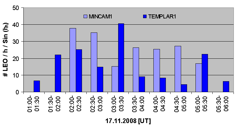 Results of the IMO Video Meteor Network - November 2008 ======================================================= For most European observers, November was a typical cloudy fall month presenting only a few clear nights. Our two American observers, on the other hand, enjoyed once more perfect conditions and collected more than 25 observing nights. Also in Portugal and parts of Italy, the weather was fine. Our new observers Paolo Ochner and Fabio Moschini, for example, who jointly operate a meteor camera in Albiano near the city of Trento, managed to collected more than 100 hours of effective observing time right at the start. As also Stefano Crivello is now operating a second camera, we have seven cameras in operation in Italy. The number of observers is identical to Germany (5). In Slovenia, Javor Kac is operating a fourth camera. Overall, we collected more than 2,200 hours of effective observing time despite the weather, which is the third best result in the IMO network. With more than 9,000 meteors, November 2008 can of course not keep up wit August or October, but it still was the best November result to date. No other meteor shower has spured on meteor science in the last decade as much as the Leonids. Meanwhile, the dust trail model has been successfully applied to predict outbursts of different meteor showers. This year, however, it was once more the Leonids that proved the strength of the model, which celebrated its first major success during the Leonid storm of 1999. On November 17, 2008, at 01:30 UT (i.e. more than a decade after the last return of the parent comet) Earth was supposed to cross the 1466 dust trail. Therefor, Jeremie Vaubaillon predicted enhanced activity with a ZHR between 25 and 100. Visual observations were rare, because weather permitted meteor observations almost nowhere in Europe, and the waning moon did the rest. Still, the live activity profile of IMO confirmed a peak ZHR of nearly 100 between 01:45 and 02:30 UT. Unfortunately, video observers were hampered similarly by the poor sky. Just a single camera in Portugal (TEMPLAR1) enjoyed clear skies all night long, but the moon crossed the field of view just at the maximum, so that only 39 Leonids were recorded in total. Other observers catched at least a part of the outburst. In Berlin, ARMEFA recorded 8 Leonids between 01:30 and 02:00 UT. BMH2 observed a total of 16 Leonids in northern Italy between 01:40 and 03:00 UT (but clouds drifted through the field of view all night long). North of Munich, skies cleared after a shower front at 02:10 UT. Until the end of night at 05:30 UT, MINCAM1 could record 67 Leonids under good conditions. In Genua the clouds disappeared completely at 04:00 UT only. Until 05:30 UT, C3P8 still recorded 37 Leonids, and STG38 11 Leonids. Figure 1 shows the hourly Leonid rate of MINCAM1 and TEMPLAR1, corrected for the radiant altitude. In addition, an empirical correction factor was applied for TEMPLAR1 to account for the percentage of the field of view glared by the moon. These data sets can only give a rough hint on the Leonid activity, but they suggest that the outburst might have lasted longer than derived from the sparse visual data. Between 01:30 and 05:30 UT, the Leonid rate was enhanced, with a maximum between 02:00 and 03:30 UT.Figure 1: Corrected hourly Leonid rates of the cameras MINCAM1 and TEMPLAR1 on the morning of November 17, 2008 What else did we learn about the Leonids from the data of the IMO network? Accoring to the last edition of the IMO handbook for meteor observers, this shower is active between November 10 and 23. In the recent analysis of the video data, almost 25,000 Leonids could be identified between November 7 and 28. Thus, this shower even outperforms the Perseids thanks to numerous video observations during the major storms of 1999 to 2002. The radiant is well defined all the time (figure 2), from which we can conclude that the extended activity interval is real. The radiant is found about a degree north of the position given in the IMO handbook.