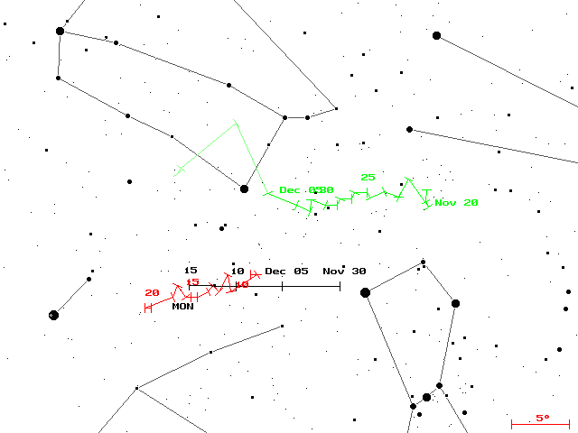 Figure 4: Radiant position of the "classical" Monocerotids (red) and the unknown meteor shower (green) from data of the IMO Video Meteor Database The "classical" Monocerotids reach their peak activity right at the beginning on December 7/8 (IMO handbook: December 8), and the second shower peaks at the end of November. The peak activity level of both showers is identical. Interestingly, also the activity profile given in the IMO handbook (blue dots) shows not just a single maximum, but enhanced rates in early December (figure 5). It suggests, that the visual profile covers the activity of both showers, which is no surprise given a peak ZHR of 2 and a radiant distance of seven degrees only. That would also explain, why according to the IMO handbook the activity of the Monocerotids starts earlier than was found in the video data.