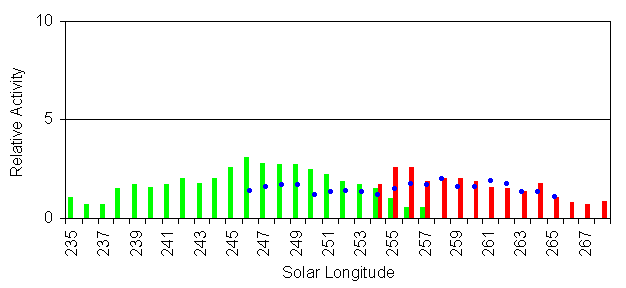 Figure 3: Activity profile of the Leonids Right after the Leonids, the alpha Monocerotids become active, whereby "active" is a relative term. If we do not witness one of the rare outbursts as in 1995, the shower is hardly noticeable. In the latest meteor shower analysis, the alpha Monocerotids were not detected at all, and also the list of individual radiants per solar longitude interval shows no sign of this shower. Instead of that, the "other" Monocerotids are present twice in the list! According to the IMO handbook, the Monocerotids are active between November 27 and December 17. Indeed, a shower with 630 meteors was found in the video data, whose radiant position and drift matched perfectly to the values given in the handbook (figure 4, red). Also the velocity (41 km/s) is in agreement with the literature (42 km/s). The second shower in the video data was found with 850 meteors between November 18 and December 9 (or December 7, if only times with a well-defined radiant are taken into consideration). Thus, the activity interval slightly overlaps with the "classical" Monocerotids. The radiant of the second shower (figure 4, green) lies about 7 degrees north of the Monocerotids, and both the amount and the direction of the radiant drift are identical. Yet, with 46 km/s velocity at infinity, the second shower is slightly faster than the Monocerotids.