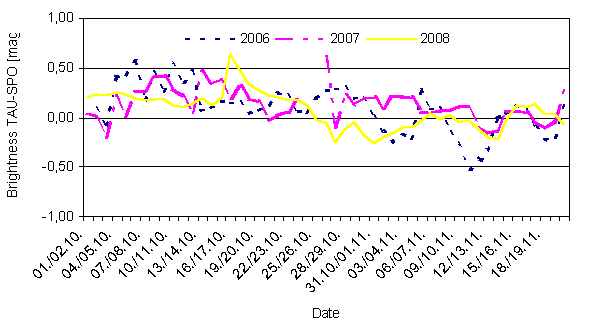 Figure 7: Mean brightness difference between the Taurids and sporadic meteors in the years 2006 till 2008 1. Observers ============ Code Name Place Camera FOV LM Nights Time Meteors -------------------------------------------------------------------------------- BENOR Benitez-S. Las-Palmas TIMES5 (0.95/50) 10 dg 3 mag 14 43.4 h 89 BRIBE Brinkmann Herne HERMINE (0.8/6) 55 dg 3 mag 5 17.9 h 94 CASFL Castellani Monte Baldo BMH1 (0.8/6) 55 dg 3 mag 15 118.3 h 354 BMH2 (0.8/6) 55 dg 3 mag 22 147.4 h 478 CRIST Crivello Valbrevenna STG38 (0.8/3.8) 80 dg 3 mag 2 20.8 h 111 Genova C3P8 (0.8/3.8) 80 dg 3 mag 14 101.3 h 581 ELTMA Eltri Venezia MET38 (0.8/3.8) 80 dg 3 mag 6 52.6 h 207 GONRU Goncalves Tomar TEMPLAR1 (0.8/6) 55 dg 3 mag 22 183.1 h 1036 HERCA Hergenroth. Tucson SALSA (1.2/4) 80 dg 3 mag 28 258.5 h 596 HINWO Hinz Brannenburg AKM2 (0.85/25) 32 dg 6 mag 17 108.0 h 489 KACJA Kac Kostanjevec METKA (0.8/8) 42 dg 4 mag 14 110.6 h 303 Kamnik REZIKA (0.8/6) 55 dg 3 mag 13 79.4 h 404 STEFKA (0.8/3.8) 80 dg 3 mag 6 31.8 h 82 Ljubljana ORION1 (0.8/8) 42 dg 4 mag 13 65.6 h 180 KOSDE Koschny Noordwijkerh. TEC1 (1.4/12) 30 dg 4 mag 3 7.4 h 21 LUNRO Lunsford Chula Vista BOCAM (1.4/50) 60 dg 6 mag 26 221.2 h 1368 MOLSI Molau Seysdorf AVIS2 (1.4/50) 60 dg 6 mag 15 71.3 h 661 MINCAM1 (0.8/6) 55 dg 3 mag 22 79.7 h 221 Ketzuer REMO1 (0.8/3.8) 80 dg 3 mag 4 13.5 h 35 REMO2 (0.8/3.8) 80 dg 3 mag 4 12.7 h 35 OCHPA Ochner Albiano ALBIANO (1.2/4.5) 68 dg 3 mag 15 112.3 h 418 PRZDA Przewozny Berlin ARMEFA (0.8/6) 55 dg 3 mag 12 67.9 h 219 SLAST Slavec Ljubljana KAYAK1 (1.8/28) 50 dg 4 mag 11 58.0 h 134 STOEN Stomeo Scorze MIN38 (0.8/3.8) 80 dg 3 mag 15 92.8 h 320 STRJO Strunk Herford MINCAM2 (0.8/6) 55 dg 3 mag 9 44.9 h 153 MINCAM3 (0.8/8) 42 dg 4 mag 8 28.7 h 88 MINCAM5 (0.8/6) 55 dg 3 mag 9 40.3 h 223 YRJIL Yrjola Kuusankoski FINEXCAM (0.8/6) 55 dg 3 mag 17 73.7 h 270 -------------------------------------------------------------------------------- Overall 30 2263.1 h 9170 2. Observing Times (h) ====================== Nov 01 02 03 04 05 06 07 08 09 10 11 12 13 14 15 -------------------------------------------------------------------------------- BENOR - 2.9 5.6 - 1.0 - 3.0 - 7.2 1.0 5.5 1.0 - - 2.0 BRIBE - - 8.4 - - - 3.3 5.3 - - - 0.6 - - - CASFL 9.3 5.1 - - - - - - - - - - - - 9.3 9.3 2.6 1.2 0.5 1.0 - - 2.7 11.7 11.7 - - - 11.8 9.3 CRIST - - - - - - - - - - - - - - 11.1 1.1 - 5.0 - - - 8.9 5.4 - - - - - - 10.3 ELTMA - - - - - - - - - - - - - 12.0 12.2 GONRU 5.2 1.8 - - 8.4 - 6.3 10.5 10.1 - - 5.1 3.1 5.8 9.5 HERCA 11.5 11.4 11.5 11.5 11.5 11.6 11.6 11.6 11.7 4.0 7.2 7.5 2.0 11.6 11.6 HINWO 10.8 1.0 5.3 - 11.9 - - 9.1 6.5 10.9 - - - - 12.1 KACJA 11.7 - 4.6 - - - - - - - 6.2 - - - 11.1 - 9.0 10.0 - 1.5 - 0.9 10.4 - - - 5.1 2.8 1.8 10.1 - - - - - - - - - - - - - - - - 4.2 5.4 - - - - 2.4 1.7 - 1.1 - - - 4.0 KOSDE 0.5 - - - - 2.7 4.2 - - - - - - - - LUNRO 10.8 5.7 4.2 2.5 7.3 11.4 11.4 11.3 5.7 6.1 7.2 8.4 11.4 11.6 11.5 MOLSI 9.7 - 2.4 - 6.6 - - - 3.1 9.7 - - - - 7.0 3.9 - 6.0 - 6.6 - 1.3 1.7 2.1 7.8 - - - 3.0 7.5 4.5 - - 0.2 - - 2.0 6.8 - - - - - - - 8.0 - - 0.3 - - 1.1 3.3 - - - - - - - OCHPA - - - - - - - 2.0 8.4 9.8 - - - 3.8 10.2 PRZDA 3.3 - - - - - - 4.0 2.0 7.6 10.6 - 6.6 - - SLAST 3.8 6.7 5.8 - - - - - - - - - - - 2.3 STOEN 10.0 - - - 5.2 1.0 - 1.3 - - - - - 12.4 12.4 STRJO 0.2 0.5 4.5 - - - 7.5 6.0 2.0 0.5 5.3 - 1.2 - - - - - - - - 3.9 8.7 1.9 - 4.5 - 0.8 - - - - - - - - 5.0 8.6 2.2 - 5.0 - 1.0 - - YRJIL 7.3 3.8 2.8 8.0 4.8 7.9 - - - - - 1.2 - 1.9 - -------------------------------------------------------------------------------- Sum 120.9 54.7 82.7 23.0 65.8 34.6 70.4111.1 76.3 69.1 52.6 28.9 28.9 75.7163.5 Nov 16 17 18 19 20 21 22 23 24 25 26 27 28 29 30 -------------------------------------------------------------------------------- BENOR 6.3 2.8 2.8 - 0.3 2.0 - - - - - - - - - BRIBE - - 0.3 - - - - - - - - - - - - CASFL 2.8 3.4 10.4 10.4 10.4 3.6 10.9 3.5 9.2 12.5 12.5 5.0 - - - 5.5 2.5 11.9 8.9 5.9 4.4 8.4 2.5 9.0 12.0 11.1 3.5 - - - CRIST 9.7 - - - - - - - - - - - - - - 8.4 3.9 7.8 5.7 - 11.5 8.4 - 3.0 12.1 9.8 - - - - ELTMA 8.1 - 6.4 - - - 10.3 3.6 - - - - - - - GONRU 12.1 6.7 12.1 11.8 9.5 12.3 12.2 5.5 7.0 12.3 12.2 3.6 - - - HERCA 11.8 11.6 11.2 - 11.3 11.9 11.9 10.5 11.5 2.0 6.0 - 1.5 6.2 3.3 HINWO - 5.2 3.3 1.0 - - - 1.7 - 6.4 9.2 10.5 0.4 2.7 - KACJA - 10.3 5.2 4.8 4.4 - 11.7 6.8 - - 9.7 12.9 - 5.9 5.3 7.3 - - 12.9 7.2 - - 0.4 - - - - - - - 1.0 1.9 8.2 1.3 - - 12.1 7.3 - - - - - - - - 10.0 4.9 7.2 - 7.4 12.4 4.5 - - 0.4 - - - - KOSDE - - - - - - - - - - - - - - - LUNRO 8.2 11.5 11.6 8.5 11.6 9.3 8.4 0.5 11.8 - - - - 10.0 3.3 MOLSI - 3.1 0.4 2.8 - - - - 1.2 - 4.6 11.1 3.2 5.7 0.7 3.8 6.1 0.1 1.2 - 1.0 - 0.5 0.2 0.7 6.9 11.4 5.0 1.4 1.5 - - - - - - - - - - - - - - - - - - - - - - - - - - - - - - OCHPA - 5.2 11.7 7.5 10.7 4.1 - 5.2 6.6 9.3 12.5 5.3 - - - PRZDA 5.8 8.7 - - 4.2 - 5.9 - - 4.7 - - - 4.5 - SLAST - 4.7 3.7 6.3 - 5.4 11.6 5.7 - - 2.0 - - - - STOEN 4.6 - 2.1 5.7 - - 6.1 2.6 2.4 8.7 10.3 8.0 - - - STRJO 2.2 - 1.5 - 1.0 0.5 - - - 0.5 - - - 6.6 4.9 2.7 - - - - - - - - 0.7 - - - 5.5 - 4.6 - - - - - - - - 1.0 - - - 7.5 5.4 YRJIL - 13.0 - 3.1 5.7 6.3 - 0.1 - - 5.6 - 2.2 - - -------------------------------------------------------------------------------- Sum 104.9110.6115.6 99.1 82.2 79.7130.3 60.9 61.9 82.9112.8 71.3 12.3 56.0 24.4 3. Results (Meteors) ==================== Nov 01 02 03 04 05 06 07 08 09 10 11 12 13 14 15 -------------------------------------------------------------------------------- BENOR - 6 13 - 1 - 4 - 10 1 9 1 - - 6 BRIBE - - 50 - - - 12 29 - - - 2 - - - CASFL 45 10 - - - - - - - - - - - - 33 41 9 7 4 2 - - 8 32 45 - - - 41 38 CRIST - - - - - - - - - - - - - - 50 6 - 15 - - - 56 20 - - - - - - 54 ELTMA - - - - - - - - - - - - - 43 53 GONRU 15 2 - - 40 - 31 73 64 - - 18 4 13 43 HERCA 28 31 20 26 25 29 27 26 21 8 10 24 3 24 28 HINWO 44 1 11 - 78 - - 57 48 48 - - - - 44 KACJA 44 - 5 - - - - - - - 10 - - - 46 - 28 36 - 2 - 2 44 - - - 68 4 25 55 - - - - - - - - - - - - - - 