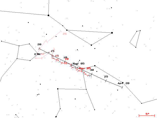 Figure 3: Radiant position of the eta-Lyrids from data of the IMO Video Meteor Database. The activity profile (Figure 4) is symmetric and reaches a maximum of about 2 at May 11. The IMO handbook gives a value of three around May 8. However, at such low rates the maximum date derived from video data is more reliable. Also here we may have another look at the observability function: As the eta-Lyrid radiant is high in the sky all night long, the correction factor is one order of magnitude smaller than that of the eta-Aquariids. That reflects also in the plain meteor counts. Even though their activity interval is more than twice as long and the maximum rate even a factor of 25 higher, the total number of eta-Aquariids recorded so far is only a factor of four larger than the number of eta-Lyrids.