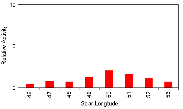 Figure 4: Long-term activity profile of the eta-Lyrids. 1. Observers ============ Code Name Place Camera FOV LM Nights Time Meteors -------------------------------------------------------------------------------- BENOR Benitez-S. Las Palmas TIMES5 (0.95/50) 10 dg 3 mag 3 4.9 h 6 BRIBE Brinkmann Herne HERMINE (0.8/6) 55 dg 3 mag 25 72.3 h 214 CASFL Castellani Monte Baldo BMH1 (0.8/6) 55 dg 3 mag 18 42.6 h 82 BMH2 (0.8/6) 55 dg 3 mag 19 62,3 h 96 CRIST Crivello Valbrevenna C3P8 (0.8/3.8) 80 dg 3 mag 27 141.8 h 340 ELTMA Eltri Venezia MET38 (0.8/3.8) 80 dg 3 mag 3 9.5 h 17 GONRU Goncalves Tomar TEMPLAR1 (0.8/6) 55 dg 3 mag 22 144.7 h 414 TEMPLAR2 (0.8/6) 55 dg 3 mag 13 100.2 h 230 GOVMI Govedic Sredisce ORION2 (0.8/8) 42 dg 4 mag 12 59.1 h 169 HERCA Hergenroth. Tucson SALSA (1.2/4) 80 dg 3 mag 26 133.9 h 195 HINWO Hinz Brannenburg AKM2 (0.85/25) 32 dg 6 mag 12 42.3 h 103 IGAAN Igaz Hodmezova. HUHOD (0.8/3.8) 80 dg 3 mag 18 80.6 h 139 JOBKL Jobse Oostkapelle BETSY2 (1.2/85) 25 dg 7 mag 16 67.2 h 303 KACJA Kac Kostanjevec METKA (0.8/8) 42 dg 4 mag 15 42.2 h 55 Ljubljana ORION1 (0.8/8) 42 dg 4 mag 21 73.2 h 110 Kamnik REZIKA (0.8/6) 55 dg 3 mag 12 60.6 h 187 STEFKA (0.8/3.8) 80 dg 3 mag 11 33.0 h 42 LUNRO Lunsford Chula Vista BOCAM (1.4/50) 60 dg 6 mag 7 14.1 h 106 MOLSI Molau Seysdorf AVIS2 (1.4/50) 60 dg 6 mag 11 46.0 h 398 MINCAM1 (0.8/6) 55 dg 3 mag 20 56.6 h 105 Ketzuer REMO1 (0.8/3.8) 80 dg 3 mag 25 90.8 h 136 REMO2 (0.8/3.8) 80 dg 3 mag 25 102.5 h 229 OCHPA Ochner Albiano ALBIANO (1.2/4.5) 68 dg 3 mag 24 80.2 h 141 PRZDA Przewozny Berlin ARMEFA (0.8/6) 55 dg 3 mag 10 42.7 h 84 SLAST Slavec Ljubljana KAYAK1 (1.8/28) 50 dg 4 mag 18 58.7 h 85 STOEN Stomeo Scorze MIN38 (0.8/3.8) 80 dg 3 mag 22 116.5 h 277 NOA38 (0.8/3.8) 80 dg 3 mag 8 36.3 h 48 SCO38 (0.8/3.8) 80 dg 3 mag 21 101.5 h 270 STRJO Strunk Herford MINCAM2 (0.8/6) 55 dg 3 mag 19 34.6 h 60 MINCAM3 (0.8/8) 42 dg 4 mag 7 12.3 h 24 MINCAM5 (0.8/6) 55 dg 3 mag 11 29.1 h 71 YRJIL Yrjola Kuusankoski FINEXCAM (0.8/6) 55 dg 3 mag 4 14.3 h 19 -------------------------------------------------------------------------------- Overall 31 2006.6 h 4755 2. Observing Times (h) ====================== May 01 02 03 04 05 06 07 08 09 10 11 12 13 14 15 -------------------------------------------------------------------------------- BENOR - 2.5 - - - - - - - - - - - - - BRIBE 2.3 0.3 2.0 0.3 - 3.8 3.6 4.0 3.0 - 4.8 - - - 2.8 CASFL 3.0 5.6 2.2 3.0 1.0 2.9 - - - - - - 1.0 0.5 - 4.2 7.6 4.2 5.0 1.5 3.9 - - - - - - 1.0 - 1.0 CRIST 7.8 4.8 6.7 - 7.1 6.6 3.1 2.6 7.1 7.4 4.1 3.0 7.3 - 1.0 ELTMA - - 5.4 - - - - - - - - - - - - GONRU 8.4 8.3 8.0 8.1 8.1 3.0 3.7 3.1 - - - - - 5.6 5.5 8.4 6.3 3.2 6.2 6.1 - - 3.9 - - - - - 6.0 1.5 GOVMI 5.5 - - - - - - 5.7 6.6 7.5 4.6 0.6 - - 4.3 HERCA 6.8 1.6 1.9 6.3 4.1 4.7 8.6 8.5 4.8 5.7 6.4 5.3 4.9 4.5 6.8 HINWO - 0.7 - - - - 5.0 - - - - - - 2.0 - IGAAN - - - - - - - - 6.5 5.3 8.3 - 1.0 1.7 5.0 JOBKL 6.2 3.1 4.6 - - - - - 2.8 - 5.6 - - - 5.3 KACJA 1.8 - 4.0 - 0.9 - 1.7 2.4 1.7 2.5 3.4 - - - - 3.9 - 1.5 - - - 3.4 1.4 1.3 2.3 5.2 - - 0.4 3.1 - - 3.9 - 0.8 - 7.5 5.4 3.9 - 5.3 - - - - - - 1.2 - 1.6 - 7.5 2.4 - - 4.4 - - - - LUNRO - - - - - 2.0 1.9 - - - - - - 2.3 3.0 MOLSI - 4.3 - 4.2 - 0.6 5.7 - - - - - - - - 1.9 4.5 - 3.3 - 0.2 2.1 0.6 0.4 2.4 - - - - - 6.8 4.7 - 6.5 - 6.4 4.3 2.2 - 1.1 3.1 6.0 5.9 5.8 0.3 6.8 5.2 0.6 5.0 - 3.4 6.3 4.1 - 4.1 4.5 6.0 5.9 5.8 0.3 OCHPA 2.1 7.4 3.1 5.2 2.1 4.1 2.1 1.0 - 2.0 2.0 3.0 1.0 - - PRZDA - 6.2 - - - 3.6 5.9 - - - 5.6 - 5.5 - - SLAST 2.5 - - - 1.0 - 2.5 - 3.3 - 2.0 - - - - STOEN 3.4 7.6 4.3 - 2.0 - 5.2 3.1 3.4 - 6.0 - 7.0 - - - - - - - - - - - - - - - - - 4.5 7.5 4.3 - 5.0 - 5.1 6.2 1.1 - 5.0 - 1.0 - - STRJO - - - - - - 2.1 2.5 0.7 1.0 3.9 4.5 0.5 - - - - - - - - - 3.1 - - - 2.0 0.5 - - 2.0 2.7 - - - - - 3.3 - - - 3.5 - - - YRJIL 3.8 3.9 3.9 2.7 - - - - - - - - - - - -------------------------------------------------------------------------------- Sum 92.1 94.8 65.0 55.8 41.3 45.2 87.3 65.5 46.6 41.3 84.2 33.9 42.5 34.6 39.9 May 16 17 18 19 20 21 22 23 24 25 26 27 28 29 30 31 ------------------------------------------------------------------------------------- BENOR - - - - 1.1 1.3 - - - - - - - - - - BRIBE 0.7 1.3 4.4 0.5 1.9 1.6 3.8 1.6 5.0 3.2 4.6 - 4.5 4.3 4.7 3.3 CASFL 2.8 1.8 - 1.7 1.0 2.5 3.8 2.0 - 1.0 1.4 5.4 - - - - 1.6 6.8 1.0 4.1 3.0 3.0 - 3.6 0.5 3.5 3.9 2.9 - - - - CRIST 5.0 5.9 6.0 6.0 6.0 5.9 2.0 6.8 4.6 5.6 5.1 5.5 5.8 - 3.0 - ELTMA - - - 1.9 2.2 - - - - - - - - - - - GONRU - 5.7 7.7 7.7 4.5 7.6 - - - 6.8 7.4 7.2 7.2 7.4 7.3 6.4 - 4.7 4.7 4.7 2.5 5.6 1.5 1.7 - 2.9 5.5 5.3 4.3 5.4 6.3 3.5 GOVMI 6.0 7.2 - - - - - - - - - - 1.3 - 3.1 6.7 HERCA 5.3 - 6.5 - - - - 1.2 4.7 4.8 4.1 8.1 5.1 4.1 5.9 3.2 HINWO 5.9 0.7 - 2.0 5.5 0.8 - - 5.5 5.4 - 4.0 - - - 4.8 IGAAN 6.0 2.0 2.5 - 5.5 - 2.0 5.3 6.0 5.5 3.8 - - 5.0 2.7 6.5 JOBKL - - - 5.0 2.5 4.8 1.8 4.5 4.5 - 4.5 - - 4.1 3.6 4.3 KACJA 2.5 7.0 0.9 - 2.0 6.6 2.4 - 2.4 - - - - - - - 7.0 5.0 6.9 3.7 3.9 - 6.8 2.7 1.0 3.6 - - 4.0 1.6 - 4.5 - - - - 6.3 5.8 6.4 4.1 4.8 - - - - - - 6.4 - - 2.3 - 2.6 4.8 - 0.1 1.6 - - - - - - 4.5 LUNRO 2.5 1.0 - - 1.4 - - - - - - - - - - - MOLSI 5.8 - - 5.1 5.4 - 5.0 - - 5.1 - 2.6 2.2 - - - 4.6 - 1.0 6.5 6.4 - 6.3 - 3.2 3.2 - 3.1 2.0 2.0 1.0 1.9 0.7 - 3.6 1.5 1.6 1.4 5.3 1.3 3.2 4.1 - - 5.0 4.4 3.8 1.8 4.7 - 5.6 3.6 0.2 2.3 2.3 - 5.2 5.1 - - 4.0 4.9 2.8 3.8 OCHPA - 3.3 2.2 4.7 0.6 - 7.5 - 1.6 2.1 - 5.3 6.3 7.3 3.1 1.1 PRZDA 3.3 - - - - 1.0 - 1.9 4.9 4.8 - - - - - - SLAST 1.5 2.8 6.2 6.5 4.6 1.8 2.9 3.4 5.2 3.7 - - 2.1 2.6 - 4.1 STOEN 7.0 4.4 6.7 5.3 5.6 6.5 6.6 4.3 - 6.3 - 6.1 6.5 5.3 3.9 - - - - - - 1.8 6.6 3.5 - 3.8 - 6.1 6.4 6.3 1.8 - 6.9 4.4 6.7 6.5 4.2 4.3 - 3.9 - 5.2 - 6.0 6.4 6.3 1.0 - STRJO 1.5 0.7 0.9 - 1.0 1.7 2.2 - 3.4 1.2 - - 2.3 2.0 1.5 1.0 - - - - - - - - 3.1 - - - 1.8 0.6 1.2 - - - 1.0 - - - 3.0 - 4.2 - - - 3.1 2.8 1.3 2.2 YRJIL - - - - - - - - - - - - - - - - ------------------------------------------------------------------------------------- Sum 81.3 64.7 76.8 77.0 81.5 71.1 78.2 51.9 74.6 86.9 40.3