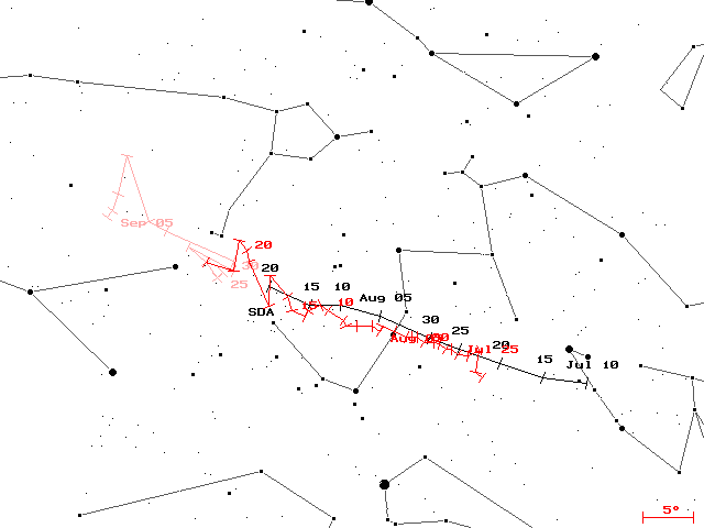Results of the IMO Video Meteor Network - July 2009 =================================================== July 2009 was an outstanding month, that raised the bar of the camera network still a bit higher. Let's start with our new observer Istvan Tepliczky, who is the second Hungarian supporting the video network. His camera HUMOB has not yet found a fixed observing site and was therefor operated at different locations in July. Together with Istvan, we had 20 observers operating 34 cameras all together in July. Next the weather should be mentioned, which was unusually good. In particular our observers in southern Europe rarely suffered from clouded nights and, thus, a total of 16 cameras obtained 20 or more observing nights. In the last week of July, there was fine weather at almost every observing site with close to 30 cameras active each night. Even though July is the month with the second shortest nights in the northern hemisphere, we managed to obtain more than 2,700 hours of effective observing time. That's not only the by far best July result to date, but the second best monthly result in the full history of the video network! Whereas the meteor counts remained low in the first few days of July, there was a significant increase once the moon disappeared in the middle of the month. Just as you get in mid-January the impression, that meteor counts are cut half from one day to the next, it felt as if they were doubling after mid-July. Beside the moon, the slowly raising Perseid activity and the maximum of the southern delta-Aquariids were to blame for this effect. On July 29, we recorded again more than 1,000 meteors in a single night, and by the end of July more than 13,000 meteors in total were obtained by the observers. Once more, there were also outstanding events in the previous month. Enrico Stomeo managed to record two blazing fireballs of visually estimated -11 mag (recorded by MIN38 and NOA38) and -20 mag (recorded by MIN38, NOA38 and SCO38) within two nights (figure 1). Such meteors are ways too bright for our cameras with are tuned for sensitivity, which is why they are hard to analyse. Still, at least a few points along their trajectory could be measured in both cases.Figure 1: Two bright fireballs recorded by Enrico Stomeo. On top an ANT from July 17, 2009, 00:46 UT, and on bottom an SDA from July 19, 2009, 01:59 UT. Now let's have a closer look at the southern delta-Aquariids, the dominating shower of the month. In our video database, they can be tracked from July 21 until well into September. However, the last radiant positions are quite uncertain, which is why we defined the end date as August 23 (figure 2).