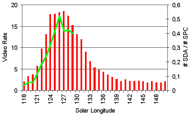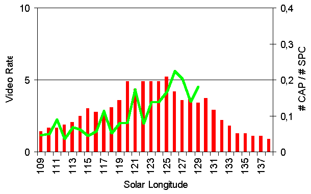 Figure 6: Long-term activity profile of the alpha-Capricornids (red bars). The green line shows the ratio between CAP and SPO in July 2009.