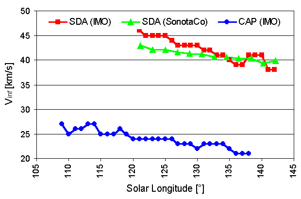 Figure 4: Meteor shower velocity v_inf of the southern delta-Aquariids and the alpha-Capricornids over solar longitude. By the end of July, the alpha-Capricornids reach their activity maximum as well, but their peak video rate of 5 is significantly lower. Also this shower has a plateau of almost constant maximum activity between July 23 and 28, with the largest value at the end of the period (solar longitude 125 deg). The radiant position is well defined between July 11 and August 11 (figure 5).
