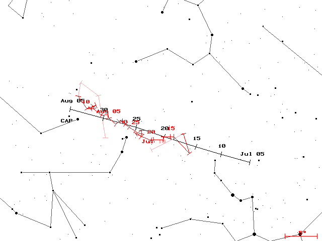 Figure 7: The radiant plot of MIN38 from July 28/29 shows the southern delta-Aquariids radiant left and the alpha-Capricornids radiant right. Last but not least it should be mentioned, that we observed a decreasing velocity for the alpha-Capricornids as well. With -0.18 km/s per degree solar longitude, the value was slightly smaller than for the southern delta-Aquariids (figure 4). 1. Observers ============ Code Name Place Camera FOV LM Nights Time Meteors -------------------------------------------------------------------------------- BRIBE Brinkmann Herne HERMINE (0.8/6) 55 dg 3 mag 23 69.6 h 309 CASFL Castellani Monte Baldo BMH1 (0.8/6) 55 dg 3 mag 8 36.4 h 136 BMH2 (0.8/6) 55 dg 3 mag 9 47.8 h 218 CRIST Crivello Valbrevenna C3P8 (0.8/3.8) 80 dg 3 mag 27 138.9 h 750 STG38 (0.8/3.8) 80 dg 3 mag 10 54.4 h 224 ELTMA Eltri Venezia MET38 (0.8/3.8) 80 dg 3 mag 17 93.5 h 349 GONRU Goncalves Tomar TEMPLAR1 (0.8/6) 55 dg 3 mag 28 181.0 h 1075 TEMPLAR2 (0.8/6) 55 dg 3 mag 28 155.7 h 585 GOVMI Govedic Sredisce ORION2 (0.8/8) 42 dg 4 mag 28 139.7 h 946 HERCA Hergenroth. Tucson SALSA (1.2/4) 80 dg 3 mag 23 75.1 h 148 SALSA2 (1.2/4) 80 dg 3 mag 23 86.7 h 225 HINWO Hinz Brannenburg AKM2 (0.85/25) 32 dg 6 mag 16 66.5 h 365 IGAAN Igaz Hodmezova. HUHOD (0.8/3.8) 80 dg 3 mag 12 85.2 h 434 JOBKL Jobse Oostkapelle BETSY2 (1.2/85) 25 dg 7 mag 13 55.8 h 335 KACJA Kac Kostanjevec METKA (0.8/8) 42 dg 4 mag 18 84.9 h 185 Ljubljana ORION1 (0.8/8) 42 dg 4 mag 27 112.2 h 310 Kamnik REZIKA (0.8/6) 55 dg 3 mag 11 42.1 h 265 STEFKA (0.8/3.8) 80 dg 3 mag 7 25.7 h 63 KOSDE Koschny Noordwijkerh. TEC1 (1.4/12) 30 dg 4 mag 17 40.2 h 95 LUNRO Lunsford Chula Vista BOCAM (1.4/50) 60 dg 6 mag 25 118.5 h 641 MOLSI Molau Seysdorf AVIS2 (1.4/50) 60 dg 6 mag 20 67.6 h 1032 MINCAM1 (0.8/6) 55 dg 3 mag 26 96.9 h 405 Ketzuer REMO1 (0.8/3.8) 80 dg 3 mag 23 80.8 h 203 REMO2 (0.8/3.8) 80 dg 3 mag 26 90.3 h 445 OCHPA Ochner Albiano ALBIANO (1.2/4.5) 68 dg 3 mag 17 74.1 h 171 SLAST Slavec Ljubljana KAYAK1 (1.8/28) 50 dg 4 mag 18 43.9 h 86 STOEN Stomeo Scorze MIN38 (0.8/3.8) 80 dg 3 mag 27 139.8 h 1047 NOA38 (0.8/3.8) 80 dg 3 mag 26 125.6 h 545 SCO38 (0.8/3.8) 80 dg 3 mag 27 142.9 h 896 STORO Stork Ondrejov OND1 (1.5/50) 55 dg 6 mag 2 9.4 h 232 STRJO Strunk Herford MINCAM2 (0.8/6) 55 dg 3 mag 14 37.5 h 115 MINCAM3 (0.8/8) 42 dg 4 mag 8 20.1 h 71 MINCAM5 (0.8/6) 55 dg 3 mag 12 35.0 h 185 TEPIS Tepliczky Budapest HUMOB (0.8/3.8) 80 dg 3 mag 6 33.6 h 295 -------------------------------------------------------------------------------- Overall 31 2707.4 h 13485 2. Observing Times (h) ====================== July 01 02 03 04 05 06 07 08 09 10 11 12 13 14 15 -------------------------------------------------------------------------------- BRIBE 3.4 5.9 0.8 4.3 - 2.3 - 0.3 0.3 - - 4.7 2.4 2.8 4.4 CASFL - - - - - - - - - - - - - - - - - - - - - - - - - - - - - - CRIST 2.0 4.3 3.7 - - 2.4 3.2 4.3 3.7 6.5 3.5 2.0 5.6 6.5 6.6 - - - 1.0 - - - - - - 4.3 - - - - ELTMA - - - - - - - - - - - 4.4 - 4.3 - GONRU 2.7 7.1 6.1 7.0 5.4 6.1 7.0 7.3 3.8 2.3 6.2 - 7.3 7.3 7.3 1.1 7.1 7.1 1.9 3.4 4.0 3.9 7.2 1.9 1.3 6.2 - 7.3 7.3 7.3 GOVMI 3.7 3.5 1.2 3.1 6.5 2.5 3.4 4.1 1.9 3.2 5.6 4.4 - 6.8 3.4 HERCA - - 2.4 - 5.4 2.9 - 2.1 0.9 1.0 4.5 3.7 1.2 1.5 - - - - - 5.4 2.9 - 2.1 2.9 1.0 4.5 4.7 4.2 5.5 - HINWO 3.1 0.5 - 1.4 - - - - - - 3.5 - 4.5 4.3 4.1 IGAAN - - - - - - - - - - - - - - - JOBKL 3.8 - 4.1 4.1 - 2.2 - 4.5 - - - 5.8 - 4.7 5.3 KACJA - - - 2.5 2.5 - - 1.0 - - 2.1 2.6 6.1 4.8 - 1.0 4.3 - 4.4 - 1.0 - 0.6 - 1.2 5.0 4.5 4.5 4.6 3.6 - 5.3 - - 3.4 - - 1.7 1.0 - - 3.3 2.0 - 3.3 - 4.6 - - 2.4 - - - - - - 2.3 - - - KOSDE - 2.7 - 2.8 2.5 - - - - - - 2.2 3.6 1.3 4.0 LUNRO - 2.1 1.0 1.9 3.5 2.6 2.7 2.2 1.4 2.6 2.9 7.4 7.7 5.8 7.8 MOLSI 2.3 3.3 - 1.3 - - - 0.1 - - 1.1 - 2.2 1.4 5.4 5.6 1.6 - 3.7 3.7 0.9 1.0 1.8 - 2.9 3.4 - 3.9 1.9 1.1 2.4 4.4 1.5 2.5 4.5 1.7 - - - 1.2 4.8 - 3.8 3.9 3.0 4.4 4.5 2.9 1.0 4.5 1.0 - - - 1.2 4.8 0.4 4.9 5.0 2.5 OCHPA - - - - - - - - - - - - 2.1 5.2 7.3 SLAST 1.2 3.5 - 2.0 2.1 - - 1.5 - - 1.1 4.2 - 5.1 3.2 STOEN 5.0 3.5 2.2 - 3.9 - - 5.2 4.1 4.5 4.1 5.3 3.2 6.5 6.4 3.5 3.0 3.0 - 2.7 - - 4.2 3.1 4.5 5.2 6.3 2.2 5.4 6.4 4.0 4.0 2.7 - 2.3 - - 6.1 3.2 4.4 5.1 6.3 3.3 5.4 6.4 STORO - - - - - - - - - - - - - - - STRJO 2.4 1.9 - 3.0 - - - - 3.1 - - - 1.7 - 3.2 - - - - - - 2.7 - - - - - - - 1.0 - - - - - - 1.0 - - - - - 3.1 2.0 2.0 TEPIS - - - - - - - - - - - - - - - -------------------------------------------------------------------------------- Sum 51.6 77.1 38.7 47.9 64.1 32.5 24.9 56.3 31.3 37.8 77.9 74.5 86.8109.3105.0 July 16 17 18 19 20 21 22 23 24 25 26 27 28 29 30 31 ------------------------------------------------------------------------------------- BRIBE 3.6 - 3.3 0.6 - 0.4 - - 0.4 5.6 3.1 5.1 5.3 1.1 4.6 4.9 CASFL - - - - - - - - 3.3 2.8 6.8 3.9 4.4 6.0 4.5 4.7 - - - - - 4.5 6.7 4.7 5.1 2.5 6.2 4.2 6.9 7.0 - - CRIST 6.7 - 5.6 3.5 2.3 6.9 6.9 4.9 - 7.0 7.1 7.1 7.2 7.2 7.2 5.0 - - 5.6 6.8 6.8 4.7 5.9 6.9 6.0 6.4 - - - - - - ELTMA 5.4 - 5.0 6.8 4.4 6.8 4.9 5.7 5.3 3.4 7.0 6.8 5.8 6.9 4.5 6.1 GONRU 7.3 7.4 7.5 5.5 - 4.2 - 7.6 7.5 7.7 7.7 7.7 7.8 7.8 7.3 5.1 7.4 7.4 7.5 4.0 - 4.2 - 6.6 6.0 7.7 5.7 7.7 6.3 5.8 6.8 5.6 GOVMI 6.8 6.5 6.5 6.5 7.0 7.0 7.1 7.1 - 5.9 6.5 6.1 4.6 7.0 - 1.8 HERCA 2.9 - 2.0 1.1 - 1.6 - 0.5 0.5 1.0 2.1 8.4 8.4 7.8 6.4 6.8 0.9 - 3.0 1.1 1.1 1.6 3.4 - 0.5 1.0 3.1 8.4 8.4 7.8 6.4 6.8 HINWO 5.4 - - 1.3 5.6 5.7 5.4 - - - 5.2 - 6.0 5.5 - 5.0 IGAAN - - - - 7.2 7.2 7.3 6.8 7.3 7.4 7.4 7.4 7.5 7.0 7.1 5.6 JOBKL - - - - - - - 4.5 - 5.3 - 4.4 - - 5.6 1.5 KACJA 6.8 - - 5.8 4.8 6.9 3.9 4.1 - 5.6 7.2 7.3 - 7.3 - 3.6 6.7 4.6 2.7 6.7 4.3 3.9 4.4 5.9 0.8 7.0 6.5 7.2 4.2 6.7 2.5 3.4 3.8 - - - - 6.7 6.8 - - 4.8 - - - - - - 3.9 - - - - 1.8 5.9 - - 4.8 - - - - - - KOSDE 0.6 0.9 - - 2.0 1.2 - 2.7 2.4 1.8 - 4.1 - - 1.8 3.6 LUNRO 7.3 6.7 4.9 6.4 7.8 7.6 8.0 4.4 - 6.0 - - - - 3.9 3.9 MOLSI 3.6 - - 4.0 4.4 5.0 1.2 - - 5.0 5.5 1.4 5.7 5.6 3.6 5.5 6.2 - - 5.3 5.8 5.4 1.5 4.0 1.0 6.6 6.6 1.8 6.7 6.8 1.8 5.9 5.1 - - 4.3 2.3 - 3.0 3.5 5.6 4.2 1.2 - 5.9 4.