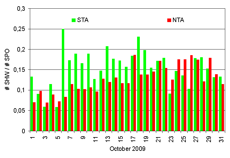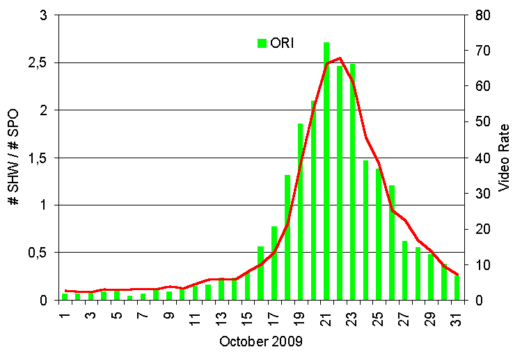 Results of the IMO Video Meteor Network - October 2009 ====================================================== Whereas for our south European and American observers the good weather continued in October, we had the typical autumn weather conditions farther north. Hence, there were just 17 cameras last month that recorded meteors in twenty or more nights. On the other hand, nights are getting longer in October. So we almost reached the August and September result and collected for the third time in a row nearly 4,000 hours of effective observing time. With respect to meteor counts, the Orionids and Taurids were clearly noticeable. With 21,500 meteors we did not quite reach the August result, but recorded a few thousand meteors more than in September. Once more, there were four non-intensified cameras (SCO38, MIN38, TEMPLAR1, C3P8) among the five cameras with highest meteor counts - only BOCAM was among the top performing cameras. The highest nightly counts were obtained with image-intensified cameras (AVIS2: 338, BOCAM:234), but the better observing conditions in Italy and Spain more than compensated for this advantage. Also in 2009, the Orionids (MDC: 8 ORI) were more active than in the years before 2006. The IMO Quick Look analysis of visual observations derived ZHR values beyond 30 between the morning of October 20 and the evening of October 23 with maximum rates of 45 in the nights of October 21/22 and 22/23. Overall, the observing conditions were less than perfect, so that only a few observers obtained longer observing series. The same happened to the video observers - beside SALSA there was not a single camera with clear skies in the full maximum period. Thus, the analysis of the 2009 data was based on averaging the data over all cameras again. For each night, the number of Orionids (7,238 in total) and sporadic meteors (9,746 in total) was determined. The ratio between both figures is a rough measure of the Orionid activity (figure 1). The Orionids show the typical symmetric profile, whereby the maximum between October 21/22 and 23/24 lasted somewhat longer than in the visual data. The long-term video rate profile of the Orionids obtained in the latest meteor shower analysis is given for comparison. Both profiles agree well.Figure 1: Activity profile of the Orionids 2009. The red line represents the long-term activity profile from the last comprehensive meteor shower analysis in autumn 2009. Figure 2 gives the same profile for the southern (MDC: 2 STA) and northern (MDC: 17 NTA) Taurids. Due to the smaller data set (1,537 STA, 1,297 NTA), the scatter is larger than for the Orionids. Still, the trend observed earlier, that the southern branch is dominating in early October, whereby both branches become equally strong towards the end, is clearly visible in the 2009 data as well.