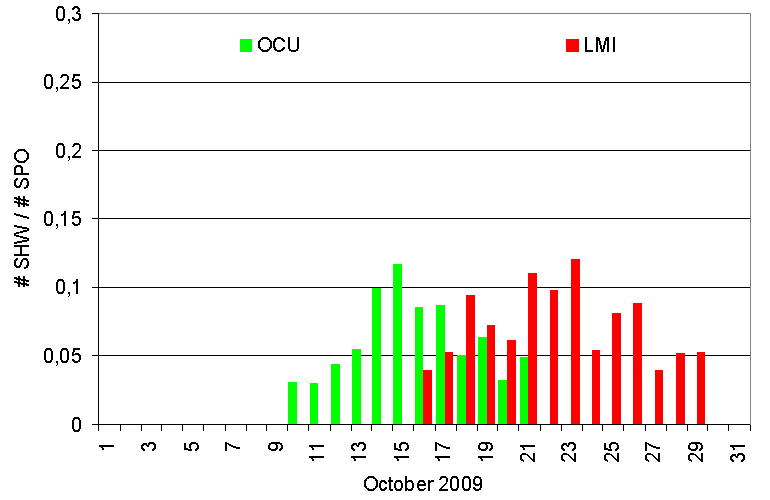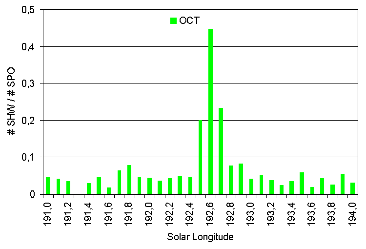 Figure 3: Activity profile of the October Ursae Majorids and the Leonis Minorids 2009. In the end let's have a closer look at the October Camelopardalids (MDC: 281 OCT). Finnish observers around J. Moilanen and E. Lyytinen noticed activity from this shower in 2005. In the same year, our camera network recorded about a dozen shower members - typically too few for a meteor shower identification. However, the activity was concentrated on a short time interval of roughly two hours in the evening with minimum sporadic activity. So the shower was clearly noticeable. Since it was never observed before, we first thought of a singular outburst. In the next year, however, we confirmed the hypothesis of E. Lyytinen, that this is in fact an annual shower. With the expected offset of 6 hours, more than 40 shower members were recorded in a short time interval. In our last full analysis of the IMO Video Meteor Database, the shower was not found with the standard parameter set, because it was ways to short for the applied minimum shower duration criterion. Still, we could identify the October Camelopardalids in the Solar longitude interval 192-193 degrees with a maximum video rate of 2.0. Based on the complete IMO Video Meteor Database including the 2009 data, I now obtained an activity profile of high temporal resolution from the shower. Between Solar longitude 191 and 194, the number of Camelopardalids (214 in total) and sporadic meteors (3,592 in total) was determined in bins of 0.1 degrees Solar longitude (about 2.5 hours). The result is given in figure 4. Despite the short interval length, the profile shows remarkably little scatter. The OCT are only active between Solar longitude 192.5 and 192.8, i.e. within about 5 to 6 hours of time. The activity outside this interval should be the sporadic background, i.e. meteors that matched only by chance the OCT radiant. At maximum (in the Solar longitude interval 192.6-192.7 degrees) the shower reaches about half the sporadic meteor count. In other words, every fifth recorded meteor in that interval was an October Camelopardalid.